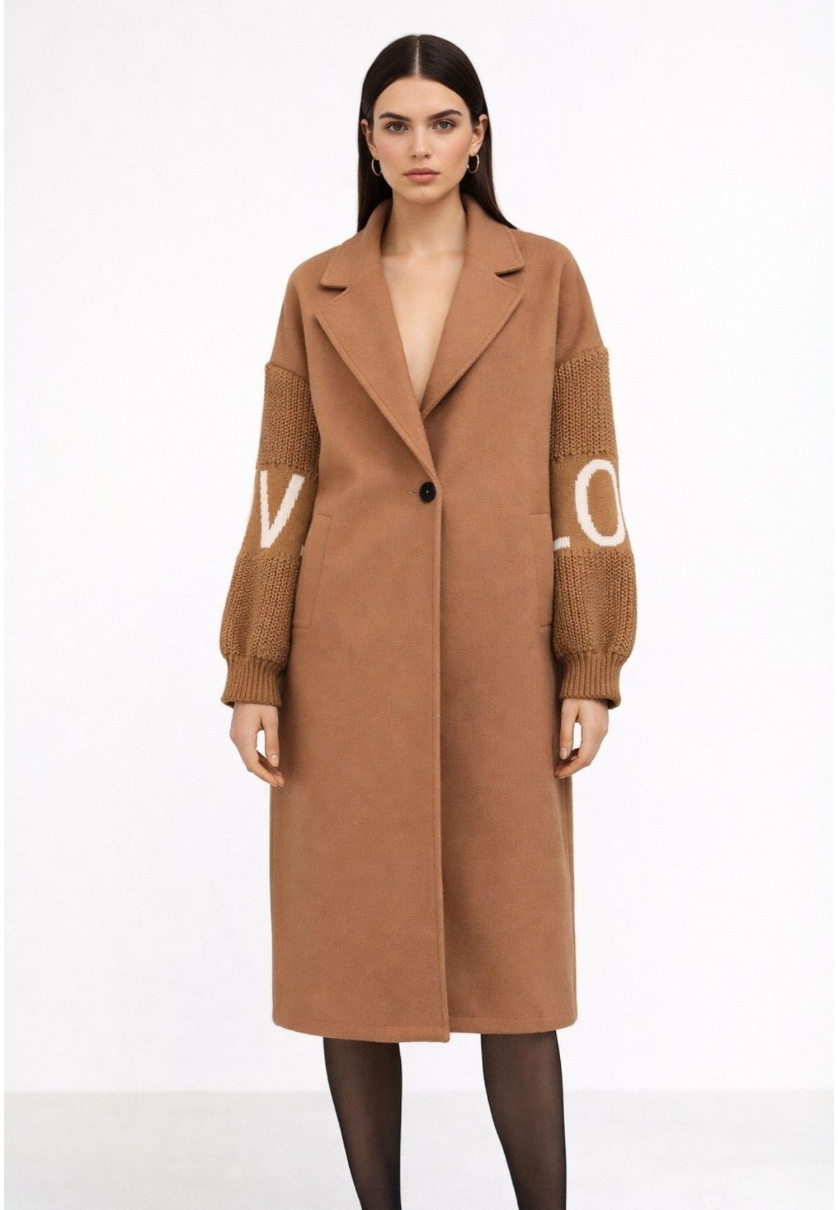 El abrigo camel con mangas de punto y detalle LOVE bordado en las mangas que combina el corte elegante de un abrigo clásico con el toque casual y moderno del punto trenzado.