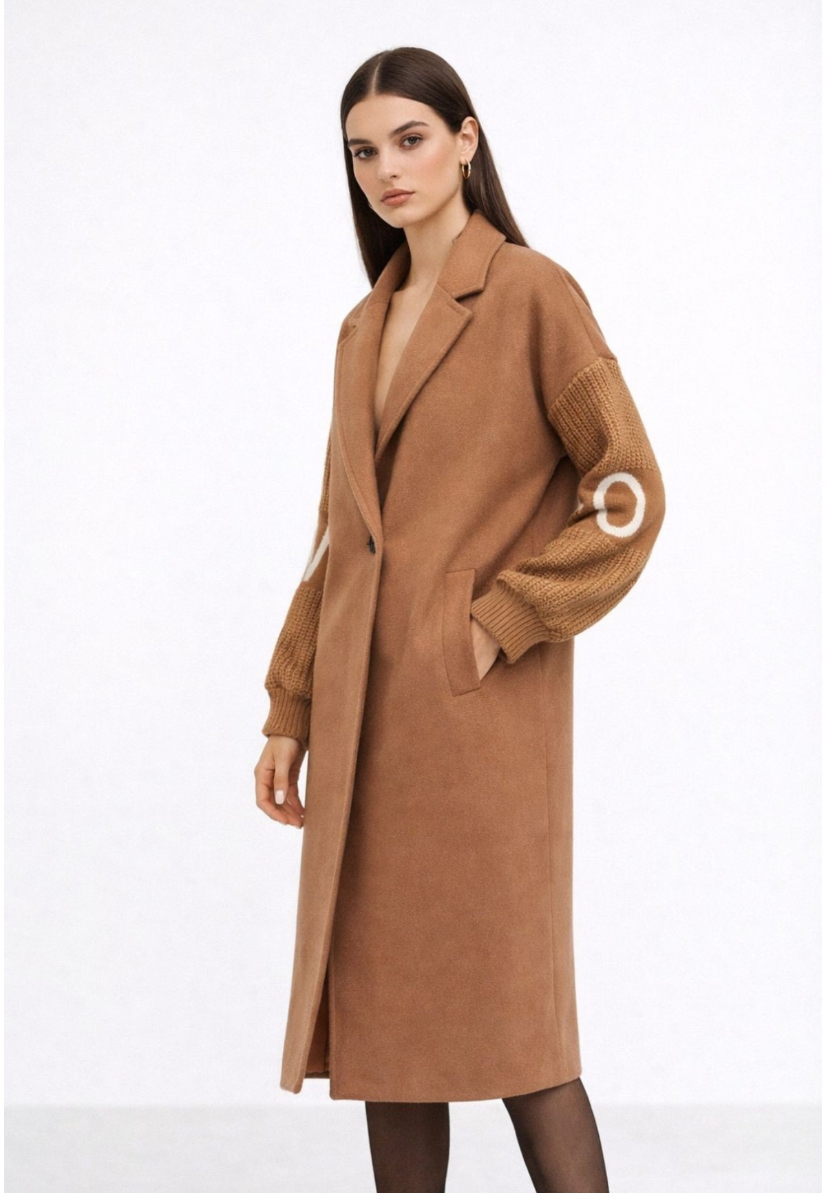 Abrigo camel mujer con mangas de punto y detalle LOVE bordado