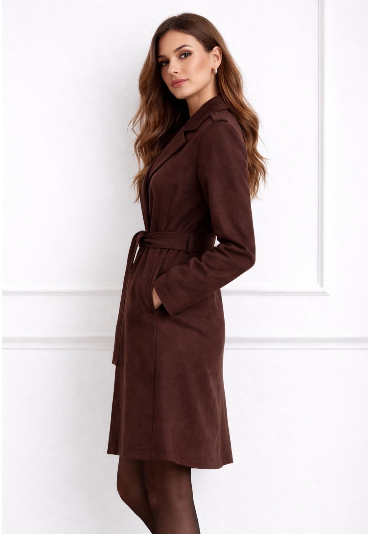 Chaqueta largo efecto ante marrón chocolate con cinturón