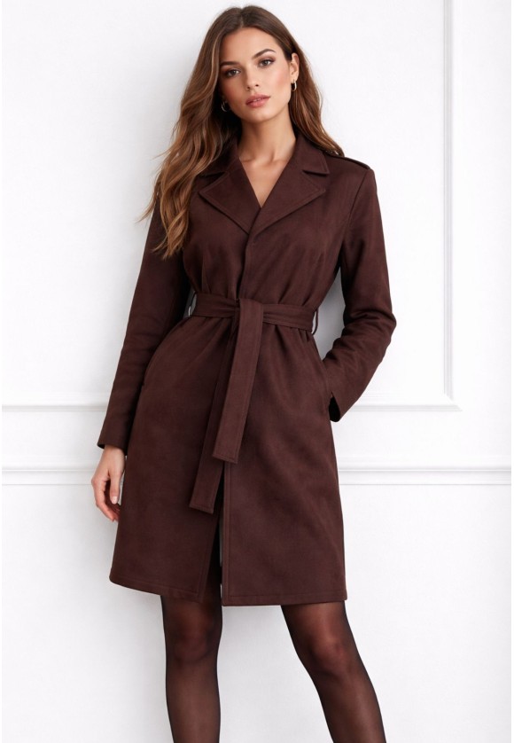 Abrigo efecto ante marrón chocolate con cinturón mujer | Bluwer