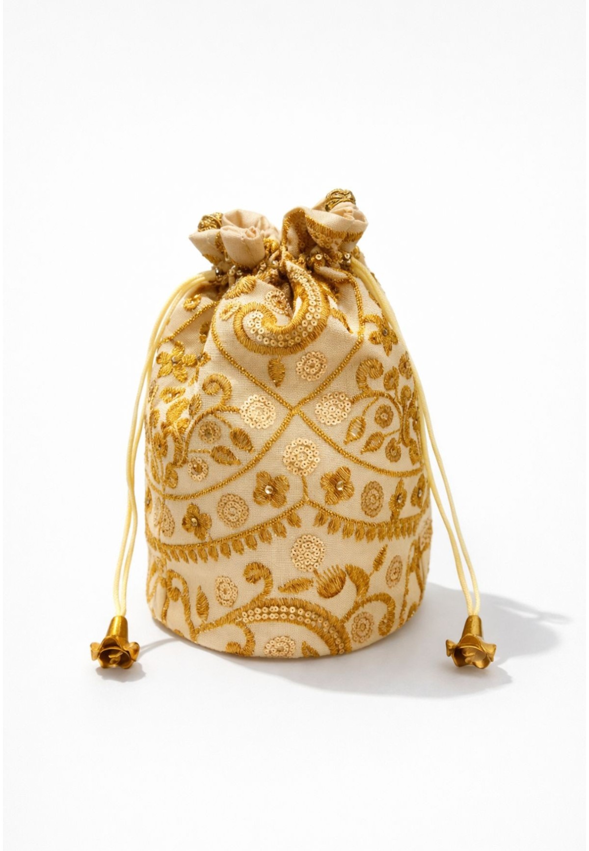 Bombonera beige para eventos con bordados y lentejuelas doradas hecha a mano