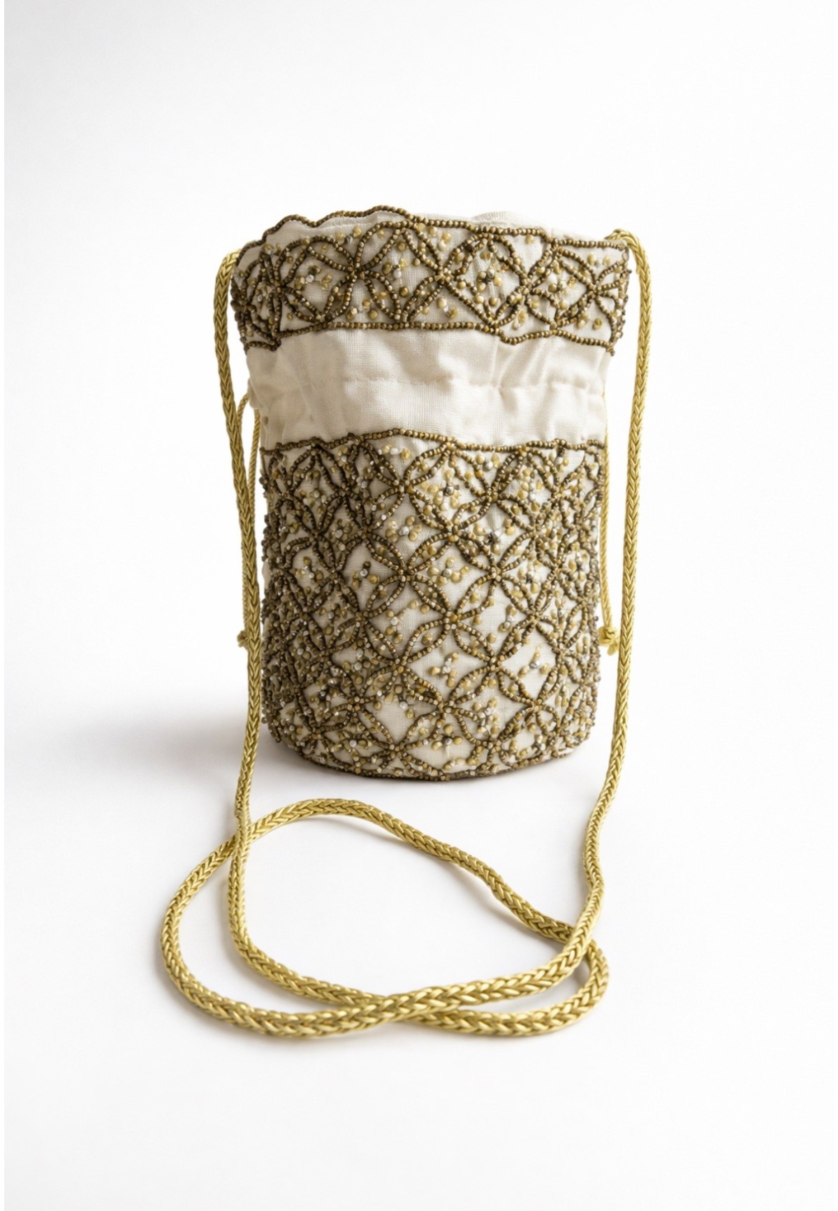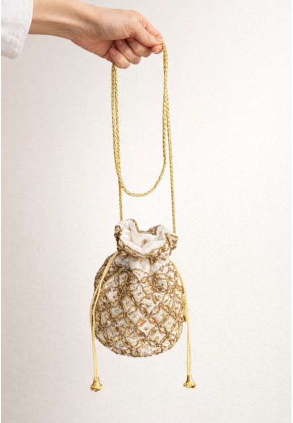 Esta bombonera blanca es una de esas piezas que elevan cualquier look de evento sin esfuerzo. Su diseño delicado, trabajado íntegramente a mano, combina bordados en tono dorado con abalorios y lentejuelas sobre una base de tejido con efecto satén, creando un acabado sofisticado y luminoso.