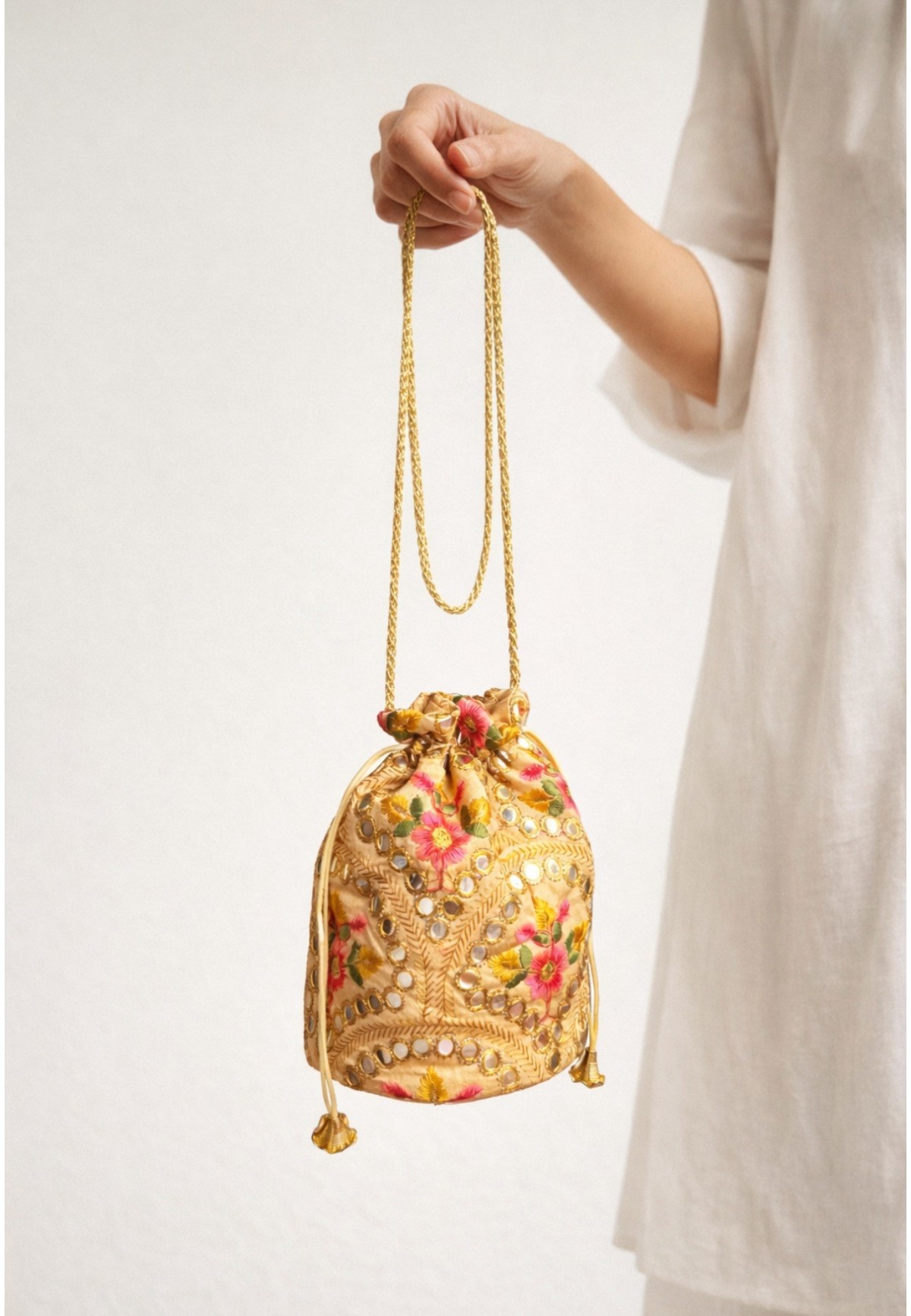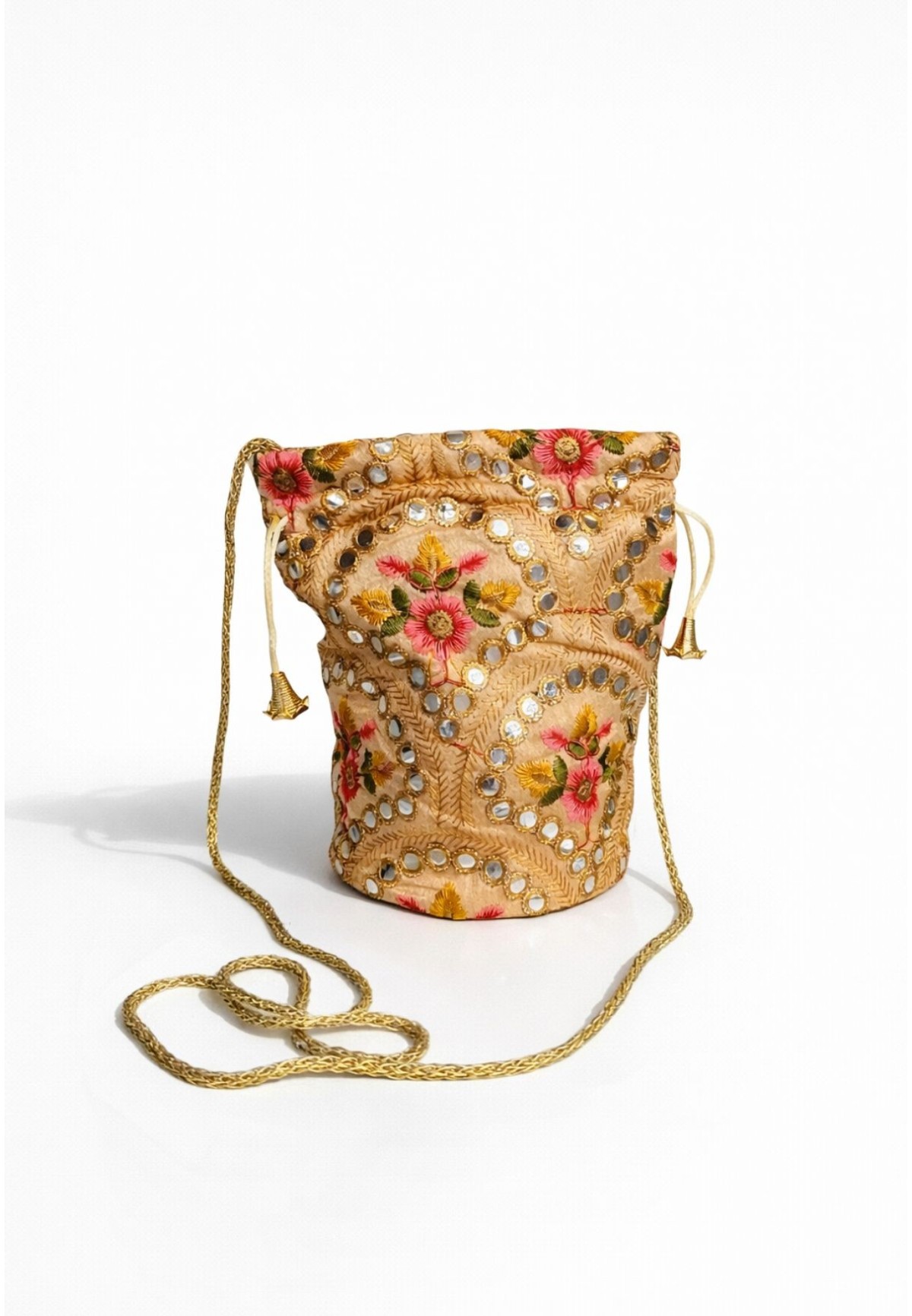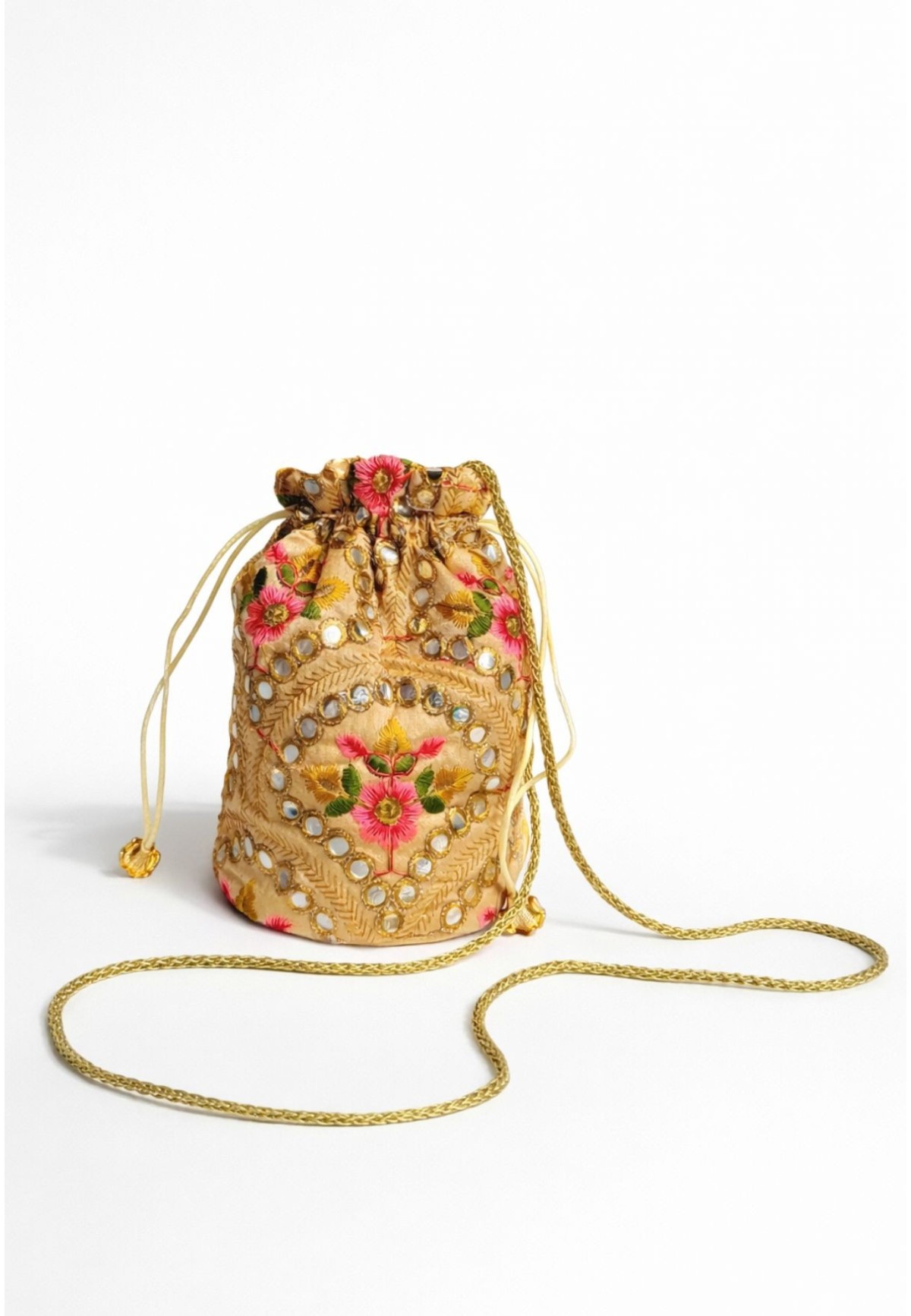 Esta bombonera es una pieza especial que eleva cualquier look de invitada. Está completamente bordada a mano, combinando flores en tonos rosas, verdes y dorados con detalles tipo espejito que aportan luz sin resultar excesivos.