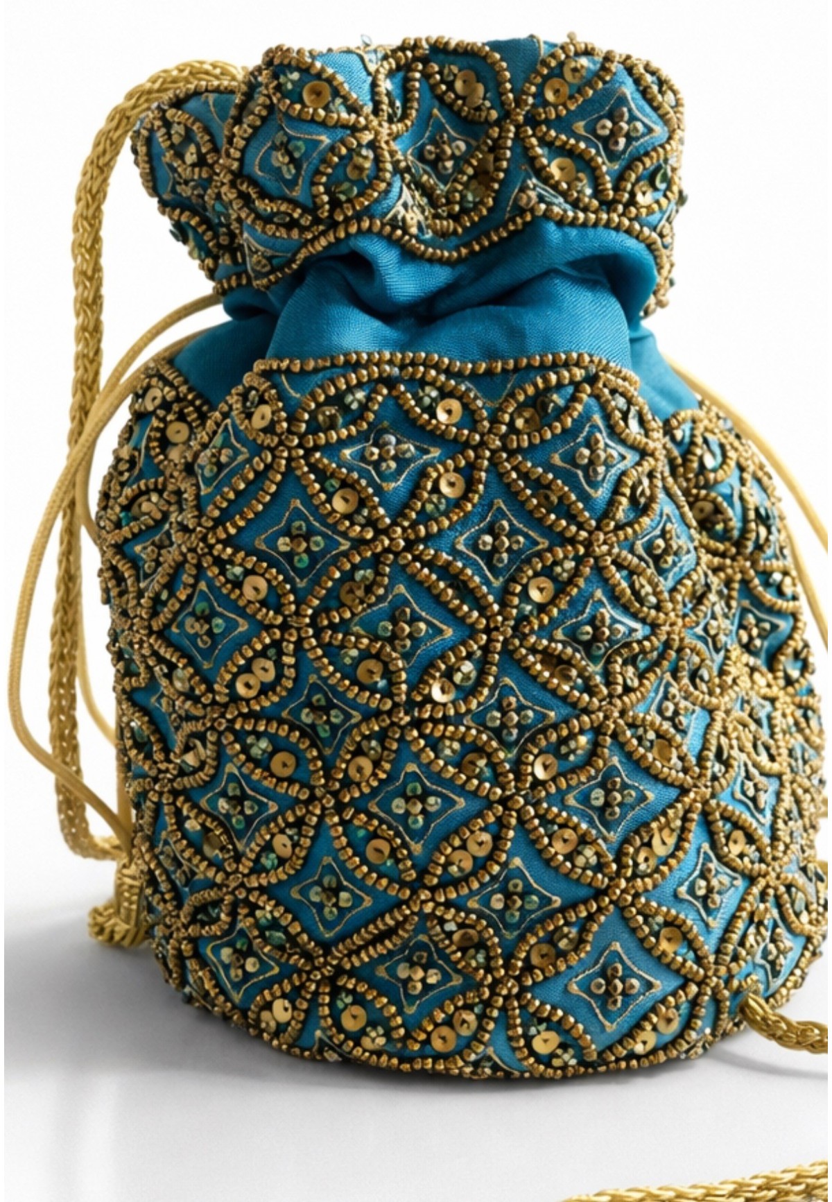 Bombonera de evento azul turquesa bordada a mano con abalorios dorados