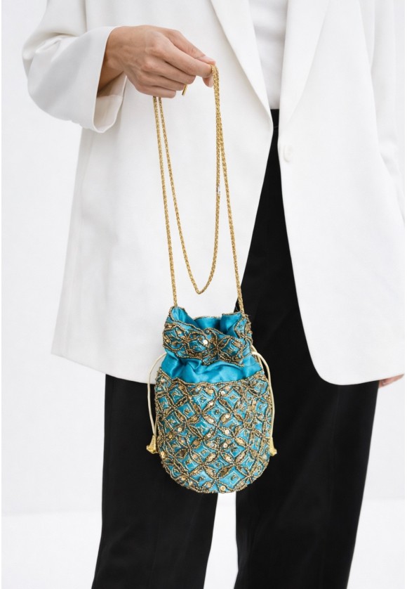 Esta bombonera azul turquesa es una de esas piezas que transforman cualquier look de invitada. Su diseño está completamente bordado a mano con abalorios dorados, creando un efecto joya que destaca por su riqueza artesanal y su carácter especial.
