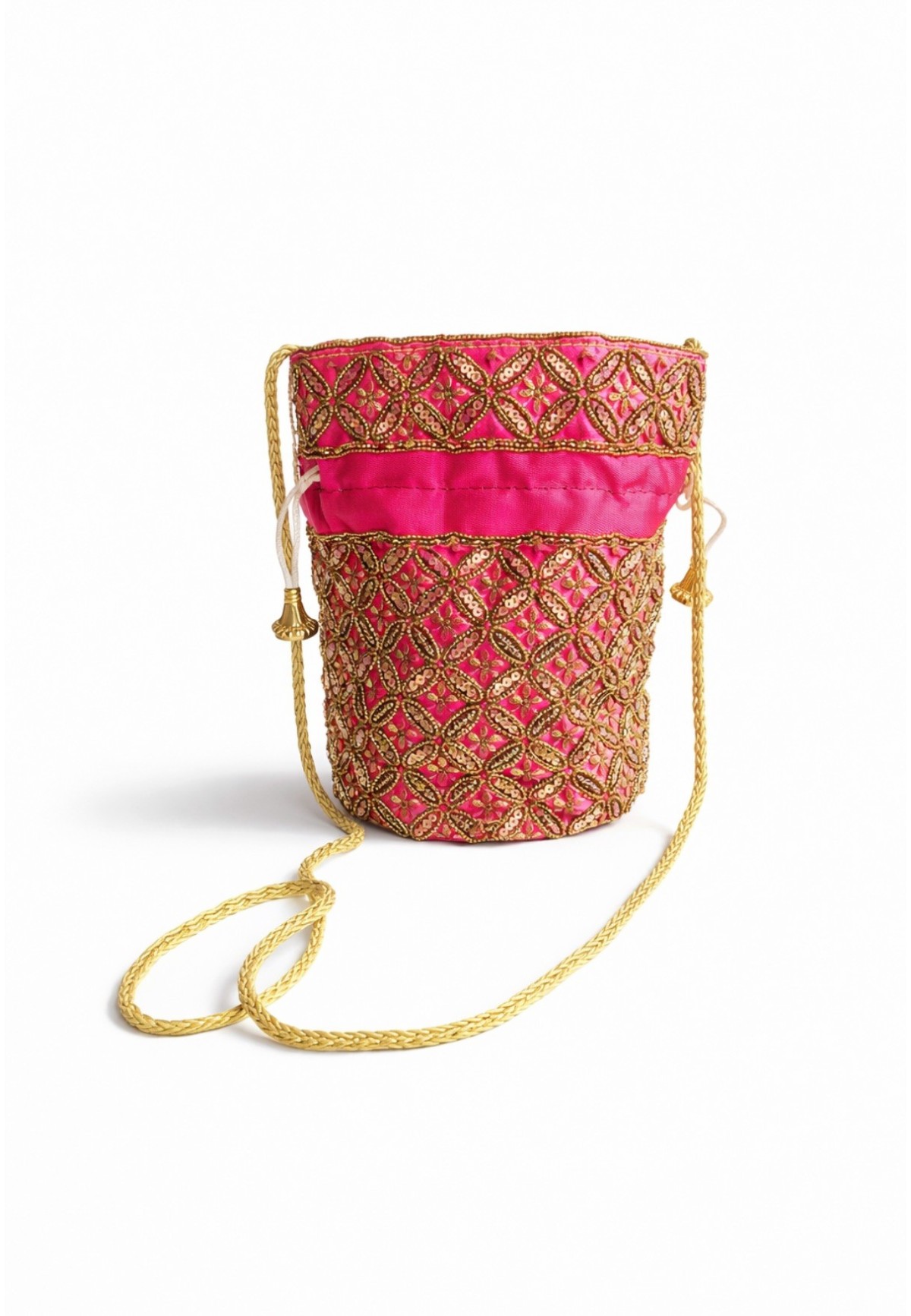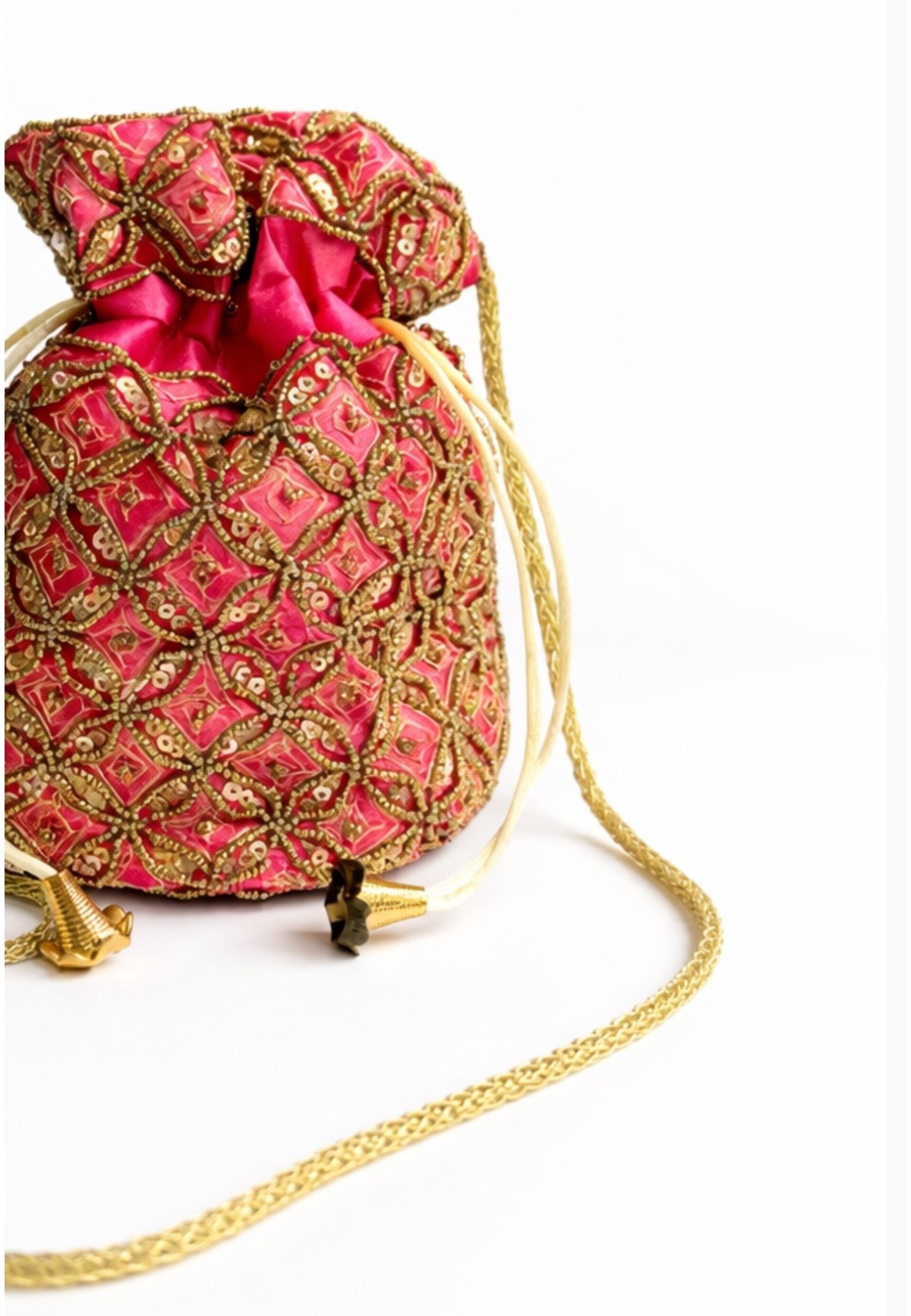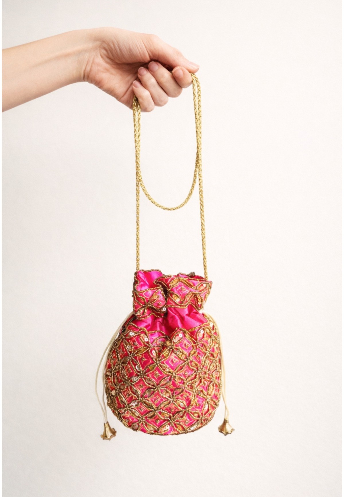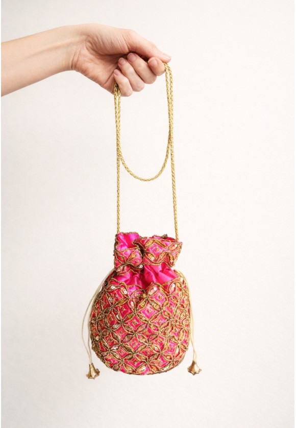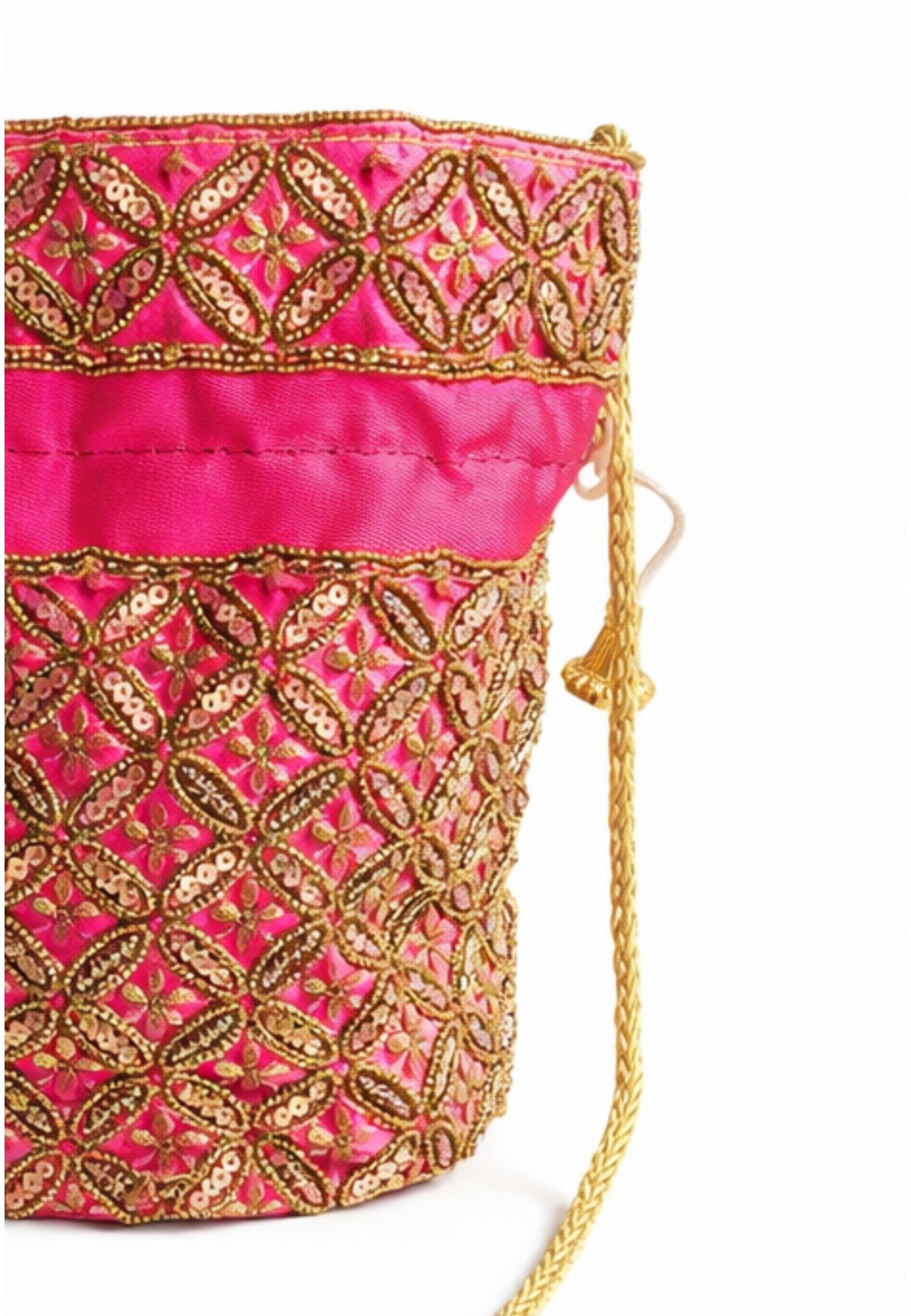 Bombonera de evento fucsia bordada a mano con abalorios y cadena dorada