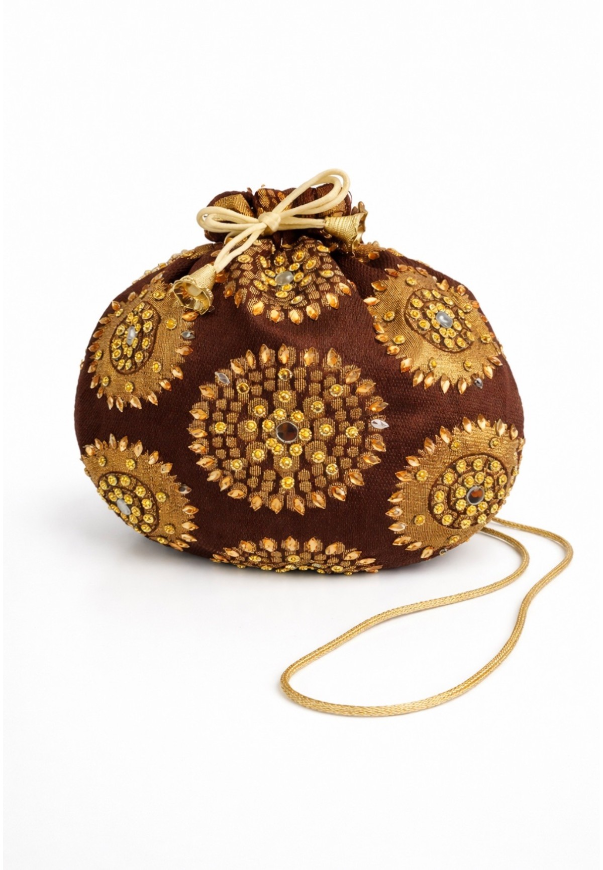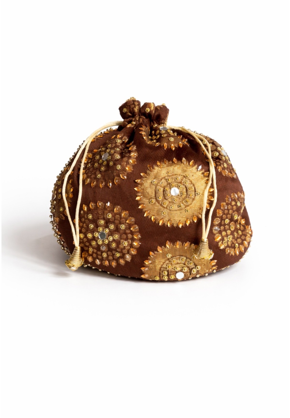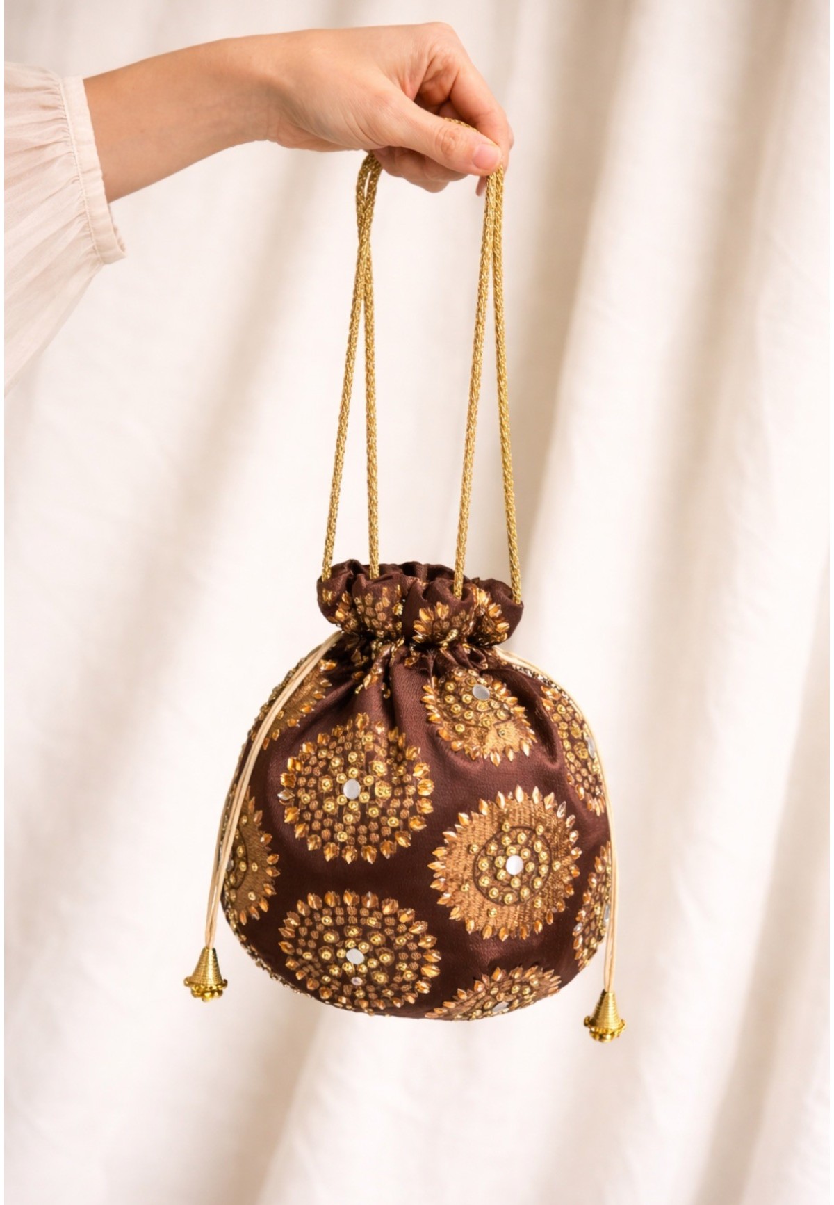 Esta bombonera redonda marrón es una pieza elegante y sofisticada pensada para completar looks de invitada y eventos especiales. Su forma redondeada aporta un aire delicado y femenino, mientras que el tono marrón profundo se combina a la perfección con el bordado dorado.