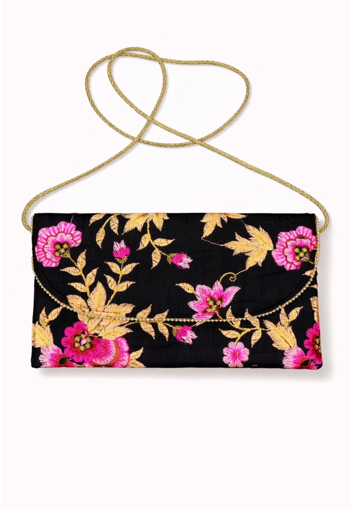 Clutch bordado a mano con flores negro - detalle ribete