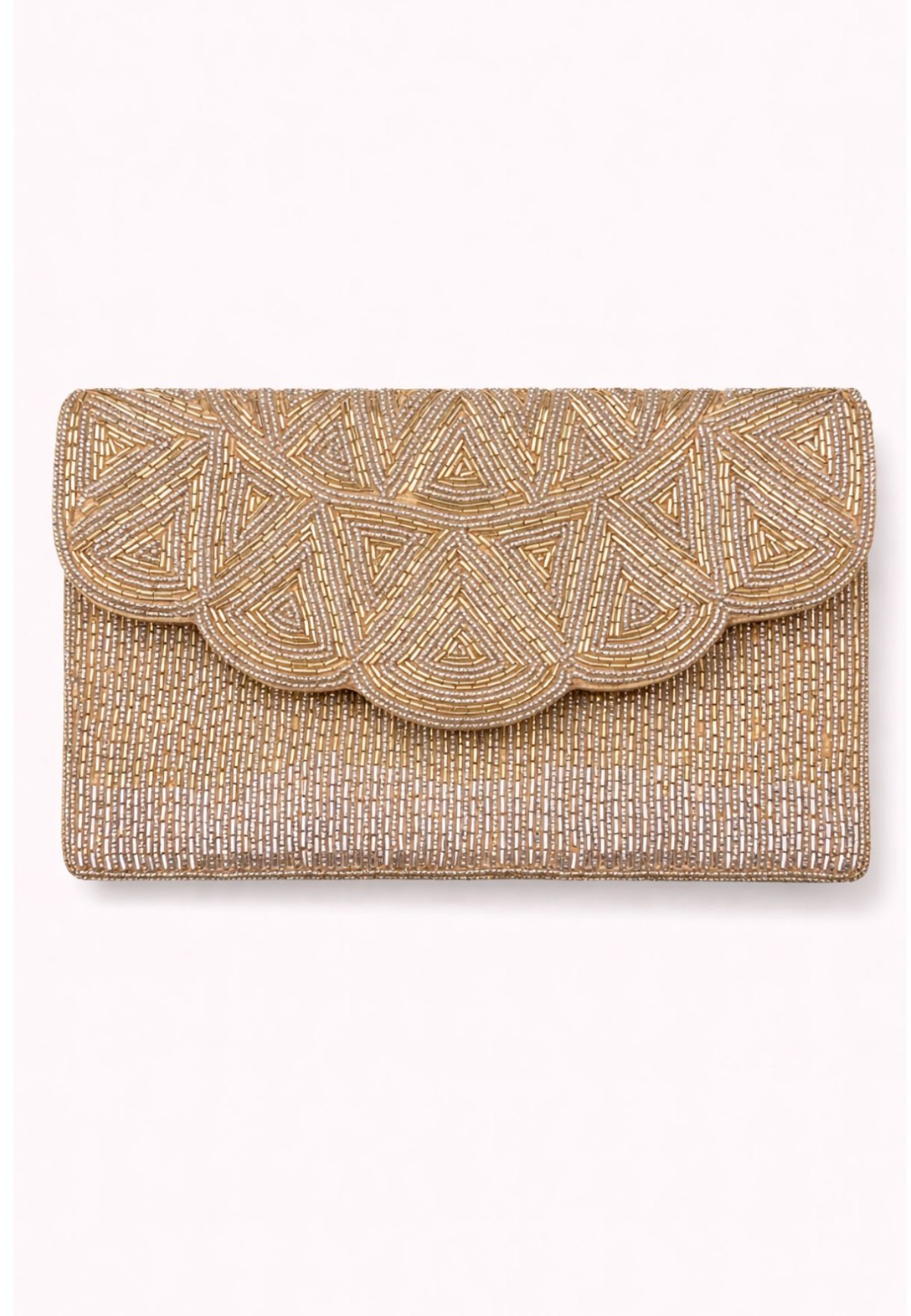 Un clutch con carácter propio. El bordado de abalorios alargados en tonos dorados y plateados crea un efecto lumínico único que cambia con la luz, convirtiendo este bolso en la pieza protagonista de cualquier look de fiesta. La solapa festoneada y el diseño geométrico le dan una elegancia con personalidad que va mucho más allá de los complementos convencionales.