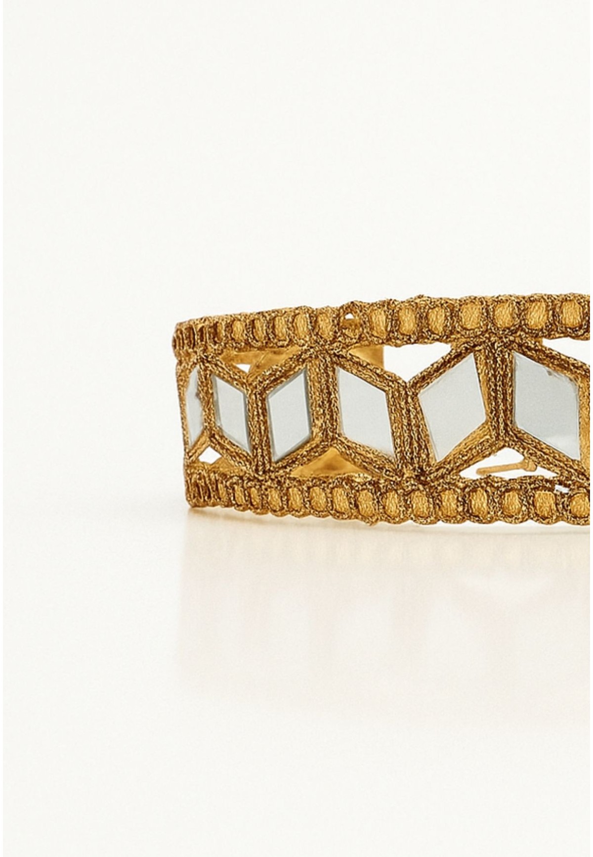 Su diseño combina pequeñas piezas de espejo colocadas de forma geométrica con una base bordada en tono dorado envejecido, creando un efecto sofisticado, delicado y muy actual.