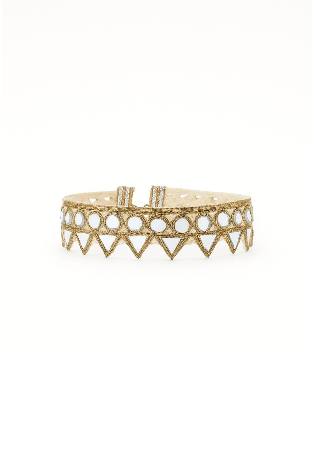 El choker dorado artesanal con formas geométricas es una de esas piezas que captan todas las miradas. Hecho a mano en India, combina un bordado de hilo dorado con un patrón alterno de círculos y triángulos invertidos, aportando un toque distintivo y moderno. Su ancho de 2,5 cm lo convierte en un complemento equilibrado: elegante, pero con personalidad.