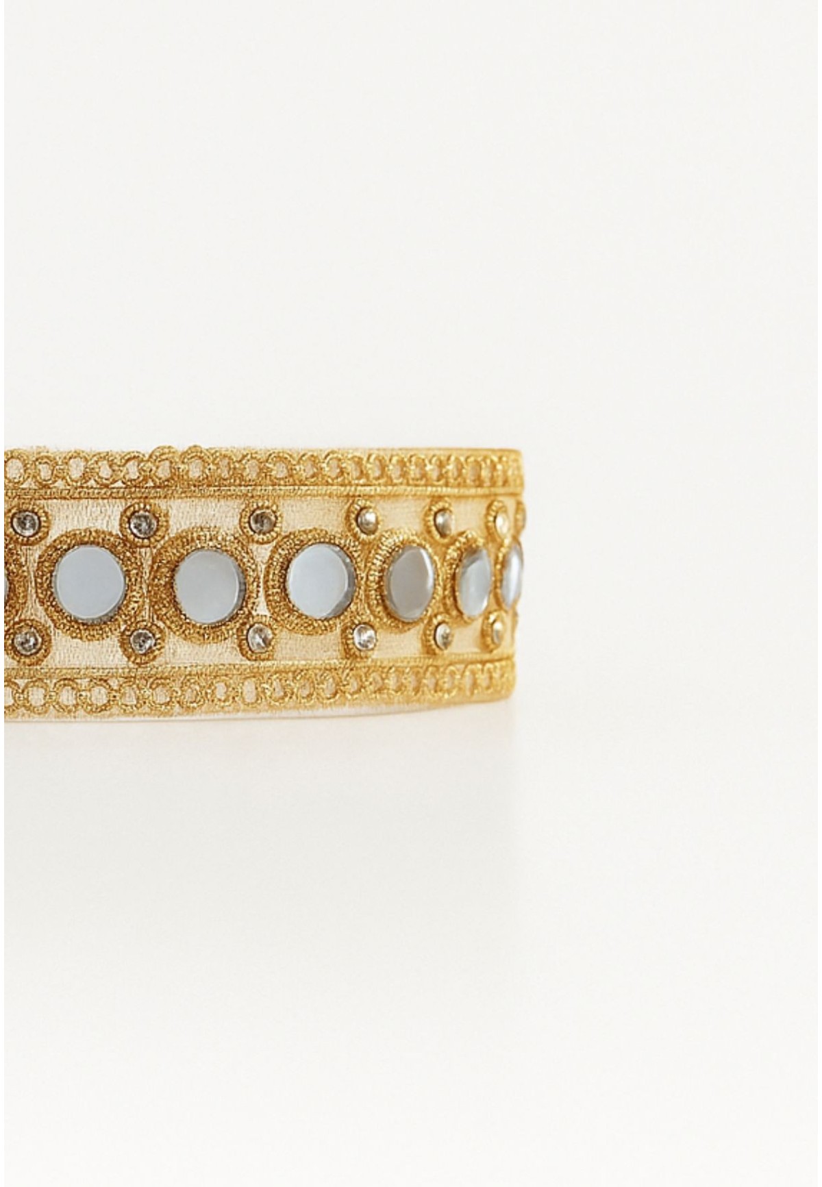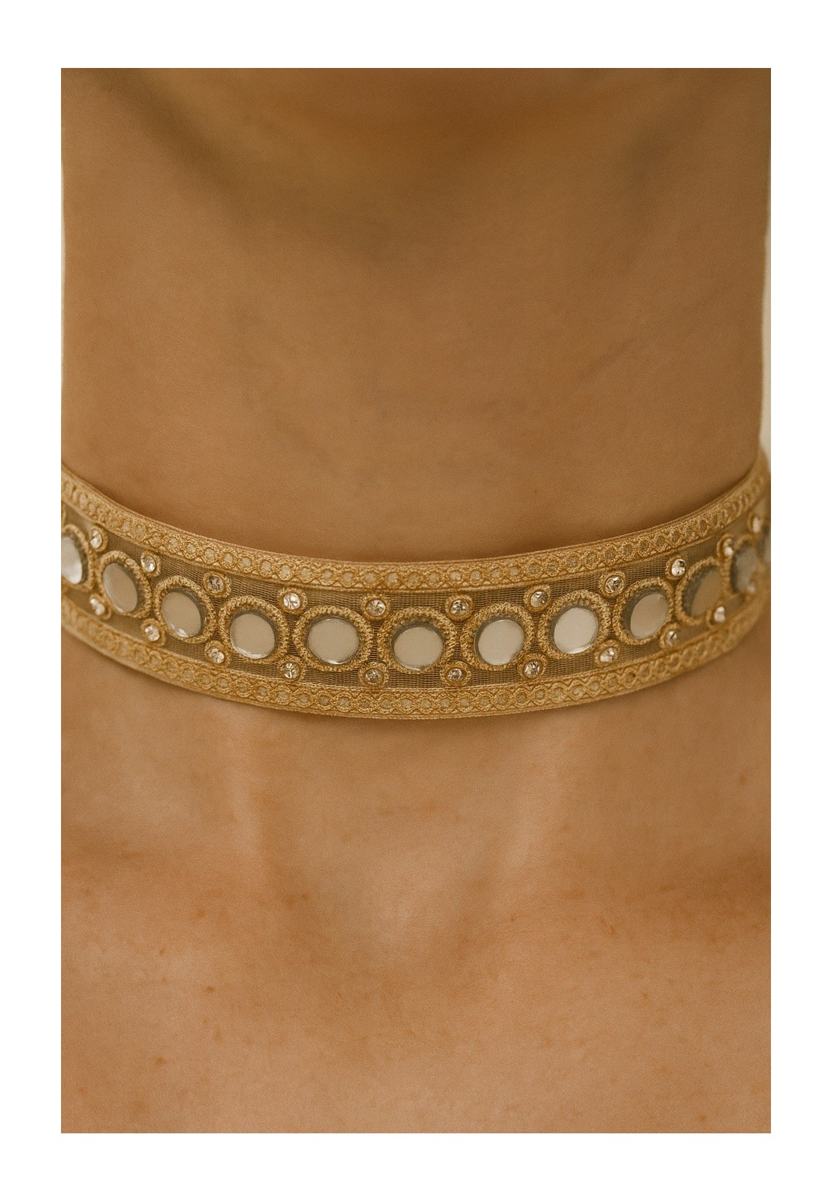 El choker dorado con espejos y cristales es una de esas piezas que elevan cualquier look al instante. Su diseño artesanal, con bordados finos en hilo dorado y pequeños espejos redondos, refleja la luz con un brillo sutil y favorecedor.