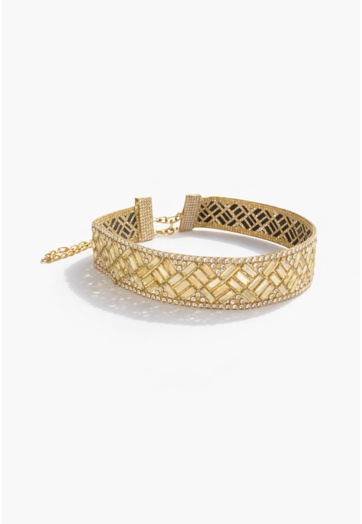 Una pieza joya con alma artesanal. Este choker dorado está confeccionado a mano con brillantitos baguette que capturan y reflejan la luz con cada movimiento, añadiendo un brillo luminoso y elegante a cualquier look. El tono dorado aporta una sofisticación atemporal que eleva tanto looks de fiesta como conjuntos más casuales.