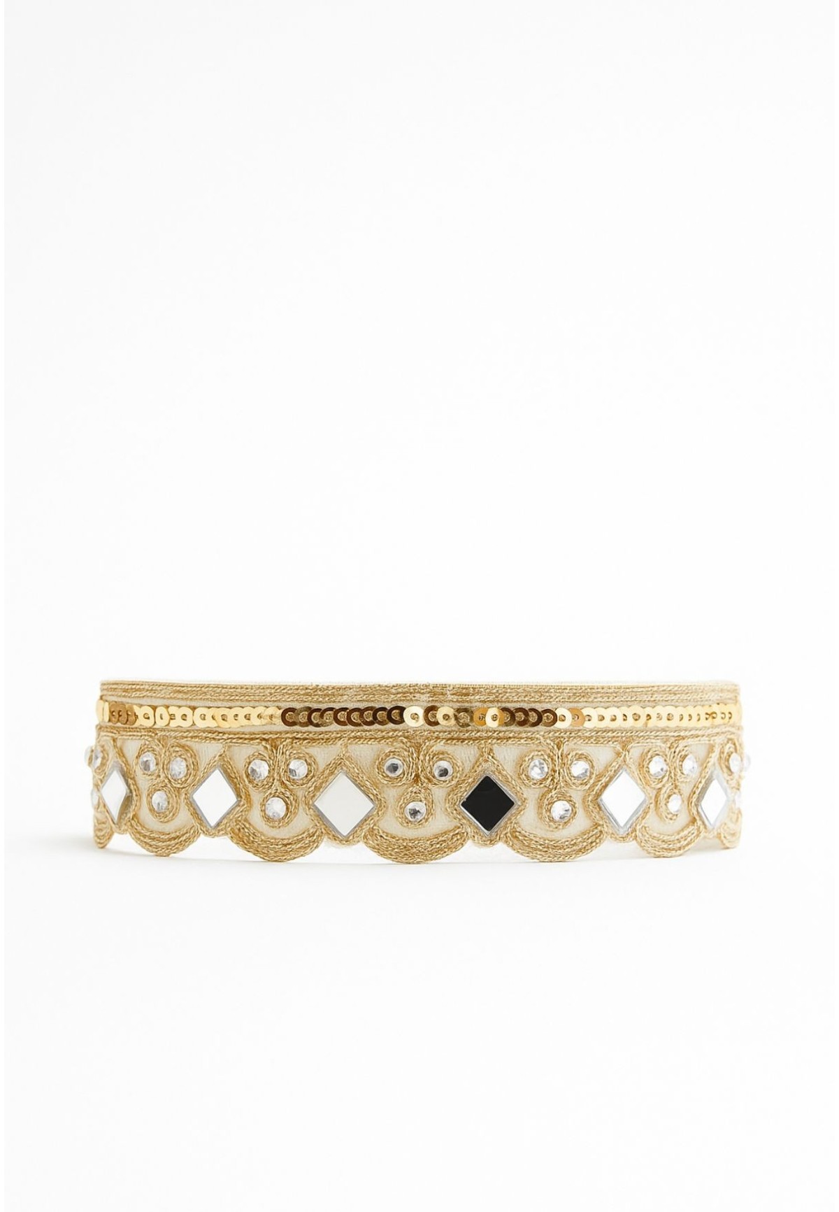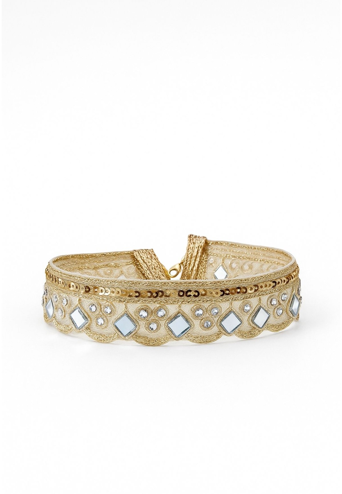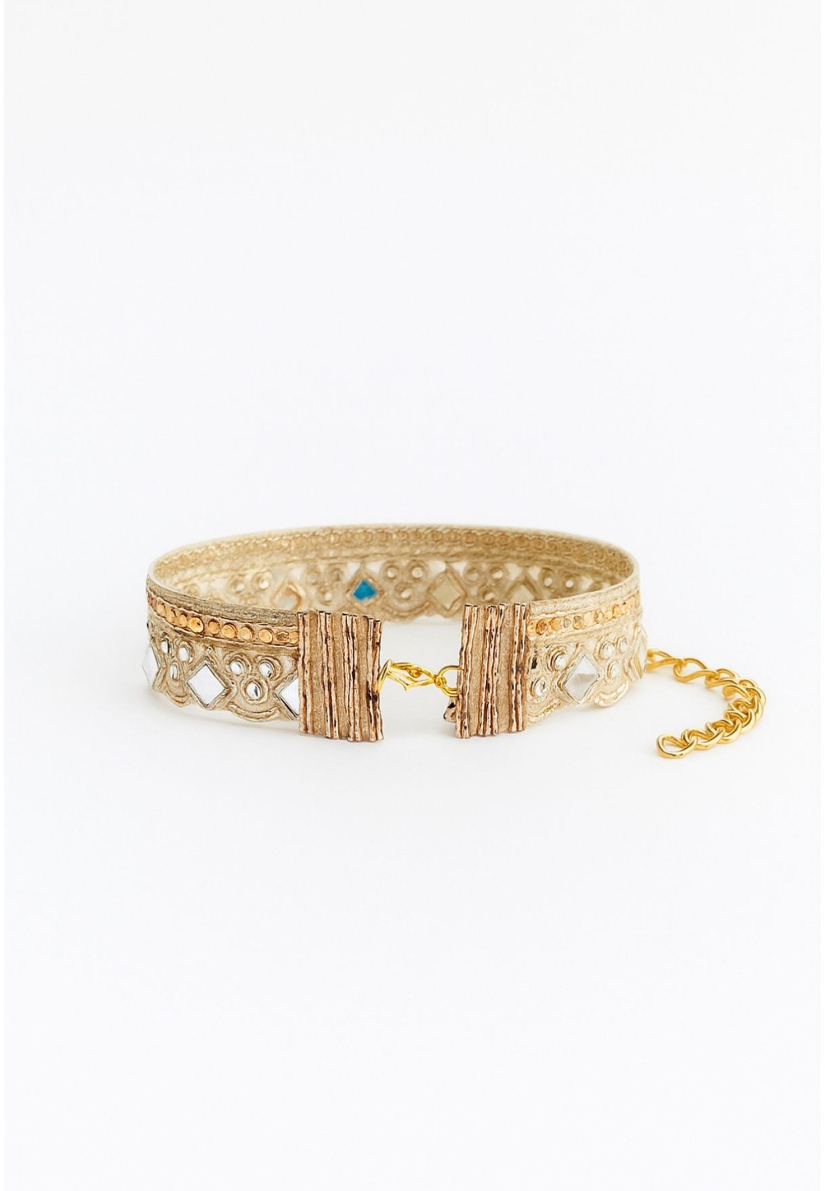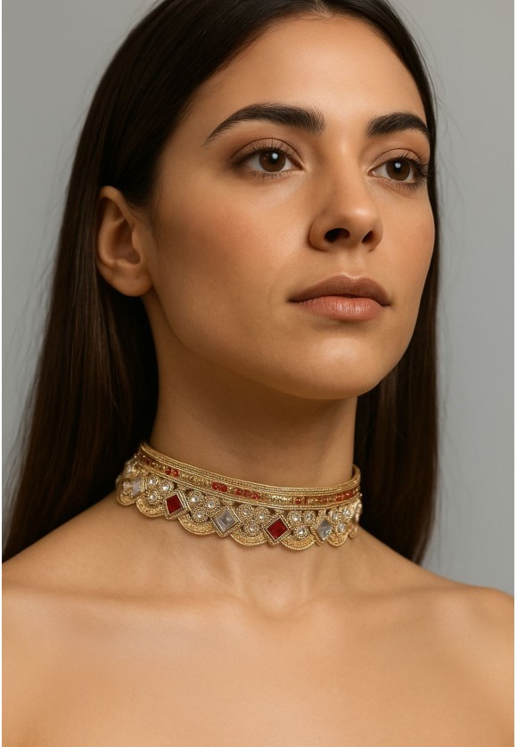 Este choker dorado combina bordado artesanal, pequeños cristales y piezas de espejo cuadradas que aportan un brillo precioso y muy femenino. Su diseño mezcla formas geométricas —rombos, círculos y líneas decorativas— con una base de hilo dorado y lentejuelas que elevan el acabado final.