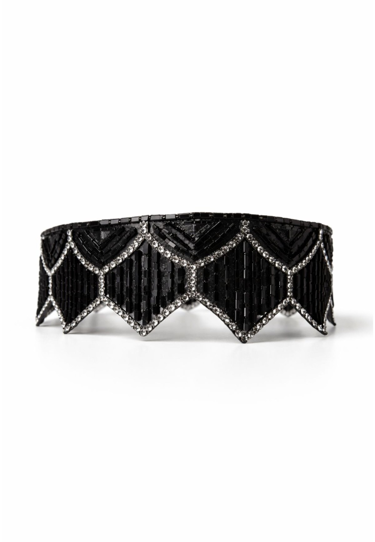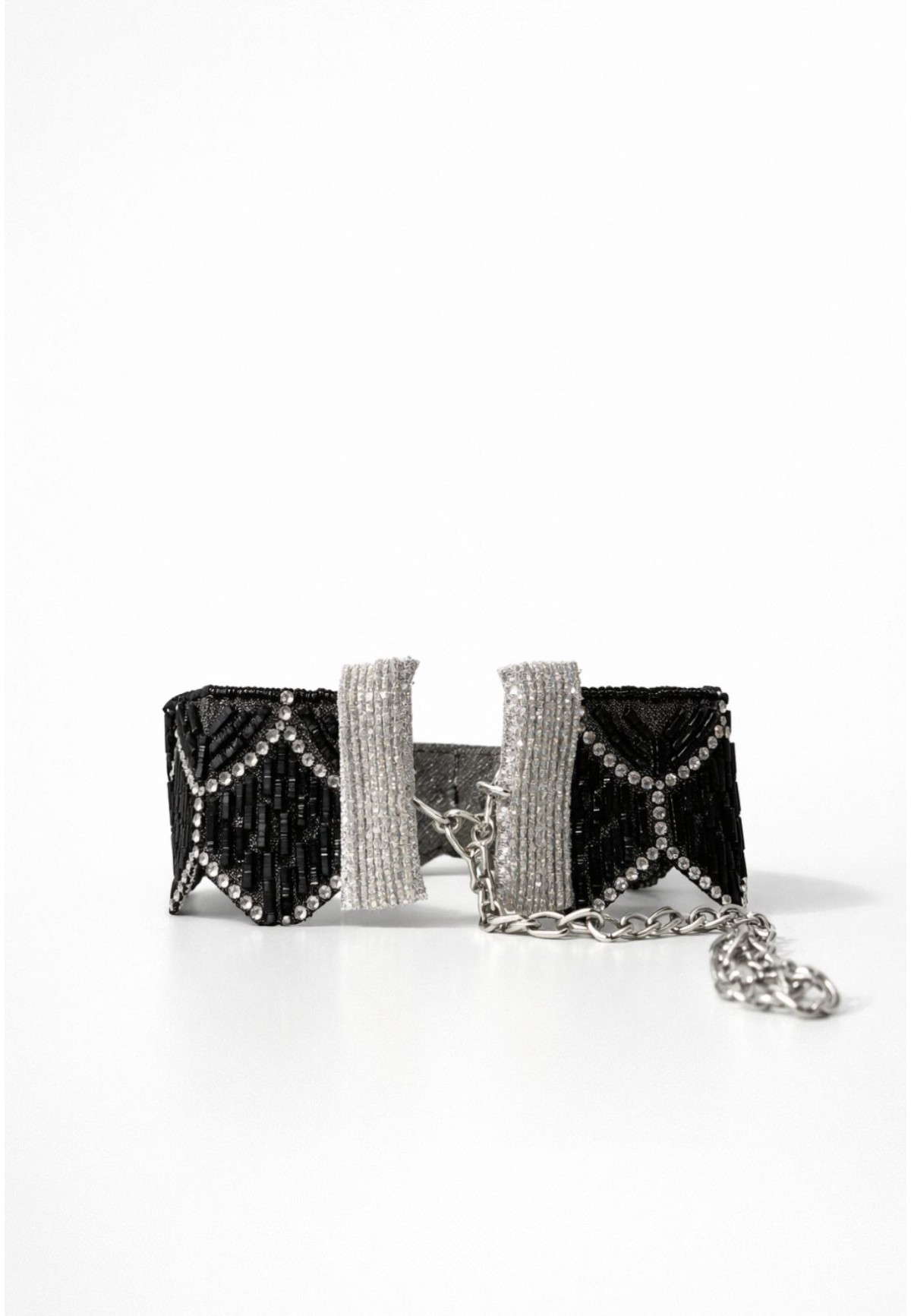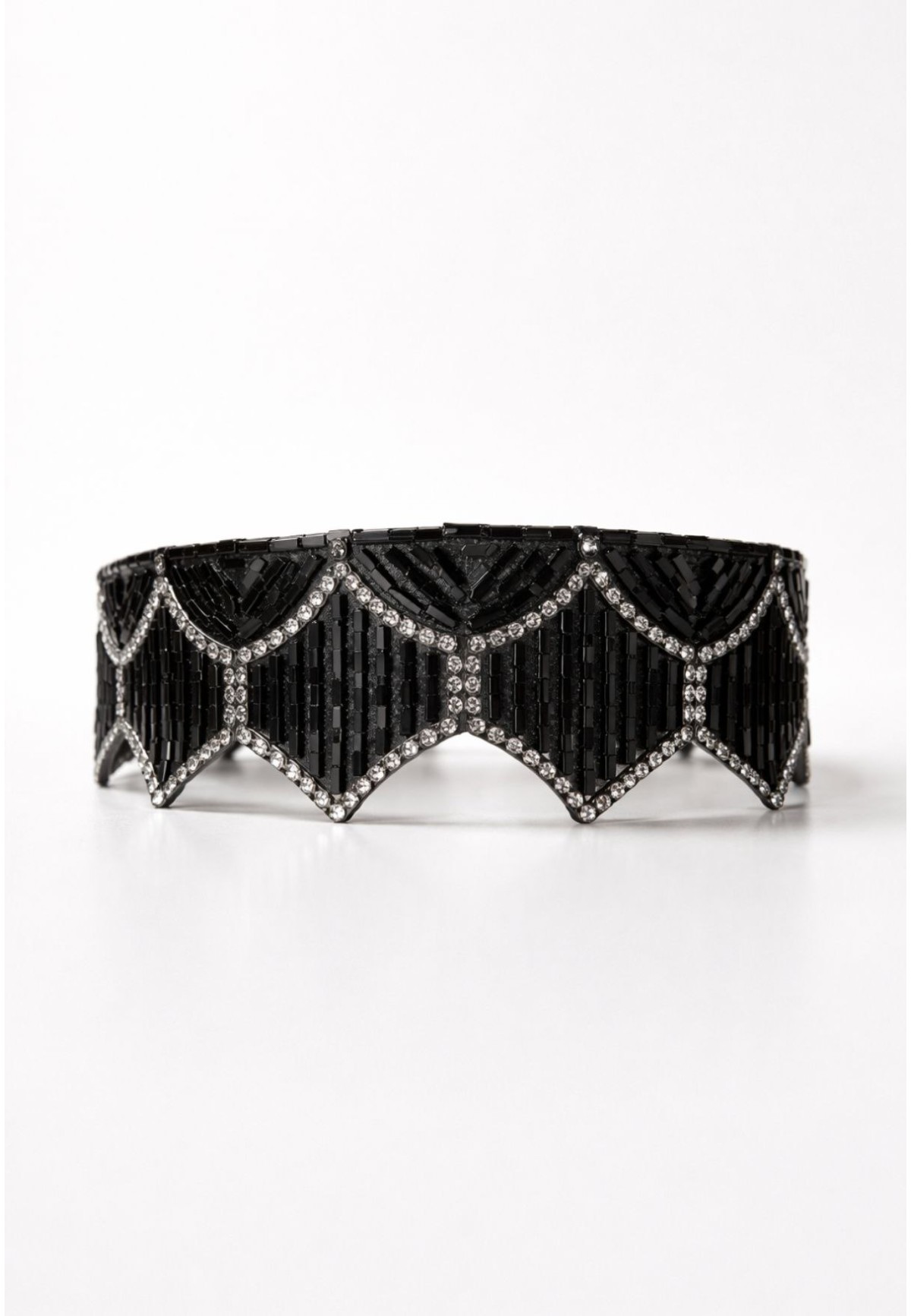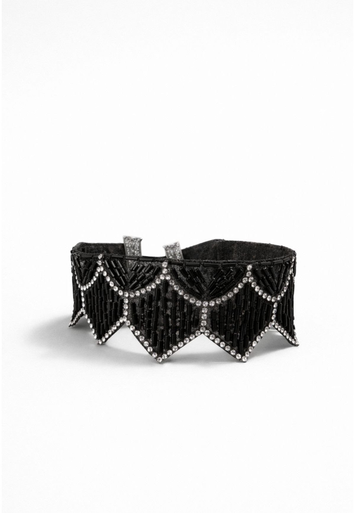 Este choker joya está diseñado para convertirse en el centro absoluto del look. Su combinación de abalorios negros tipo baguette y cristales crea un juego de luces elegante y sofisticado que realza el cuello y estiliza el escote.