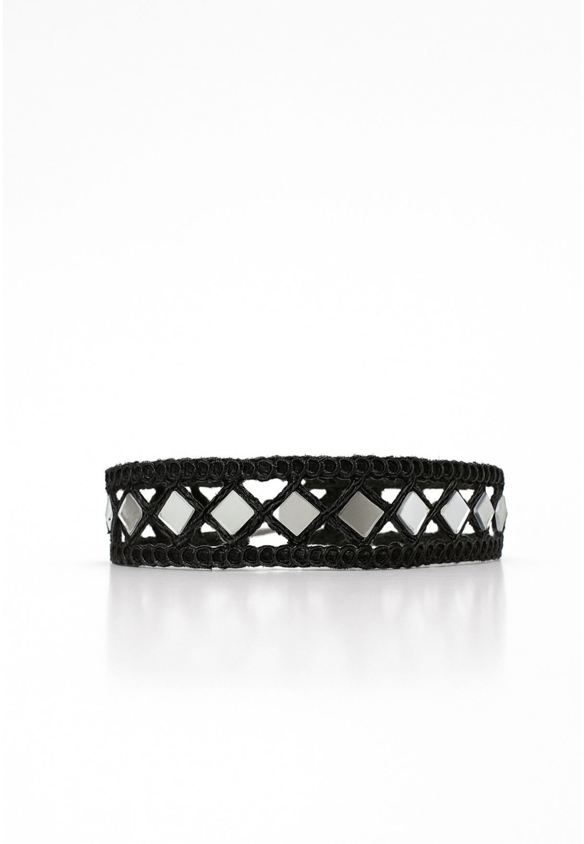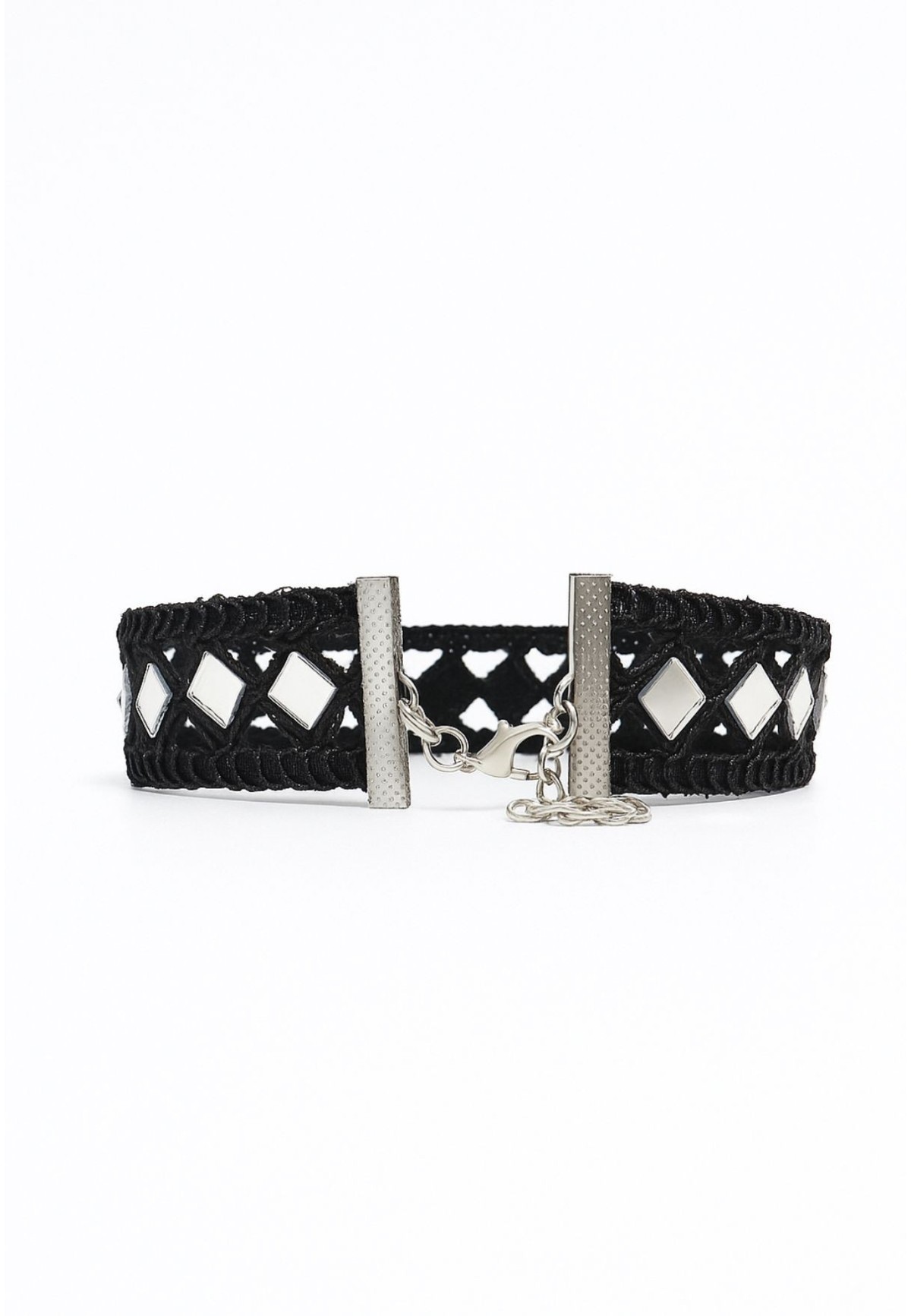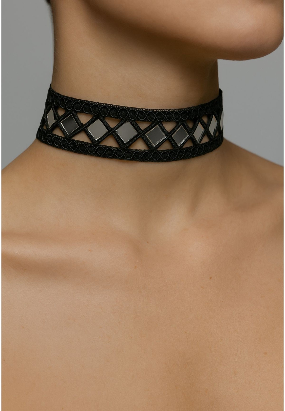 Este choker negro estrecho juega con formas geométricas y pequeños espejos que aportan un brillo sutil y moderno al cuello. La combinación de rombos y triángulos reflectantes crea un diseño llamativo pero equilibrado, perfecto para elevar looks del día a día o darle personalidad a un conjunto más arreglado.
