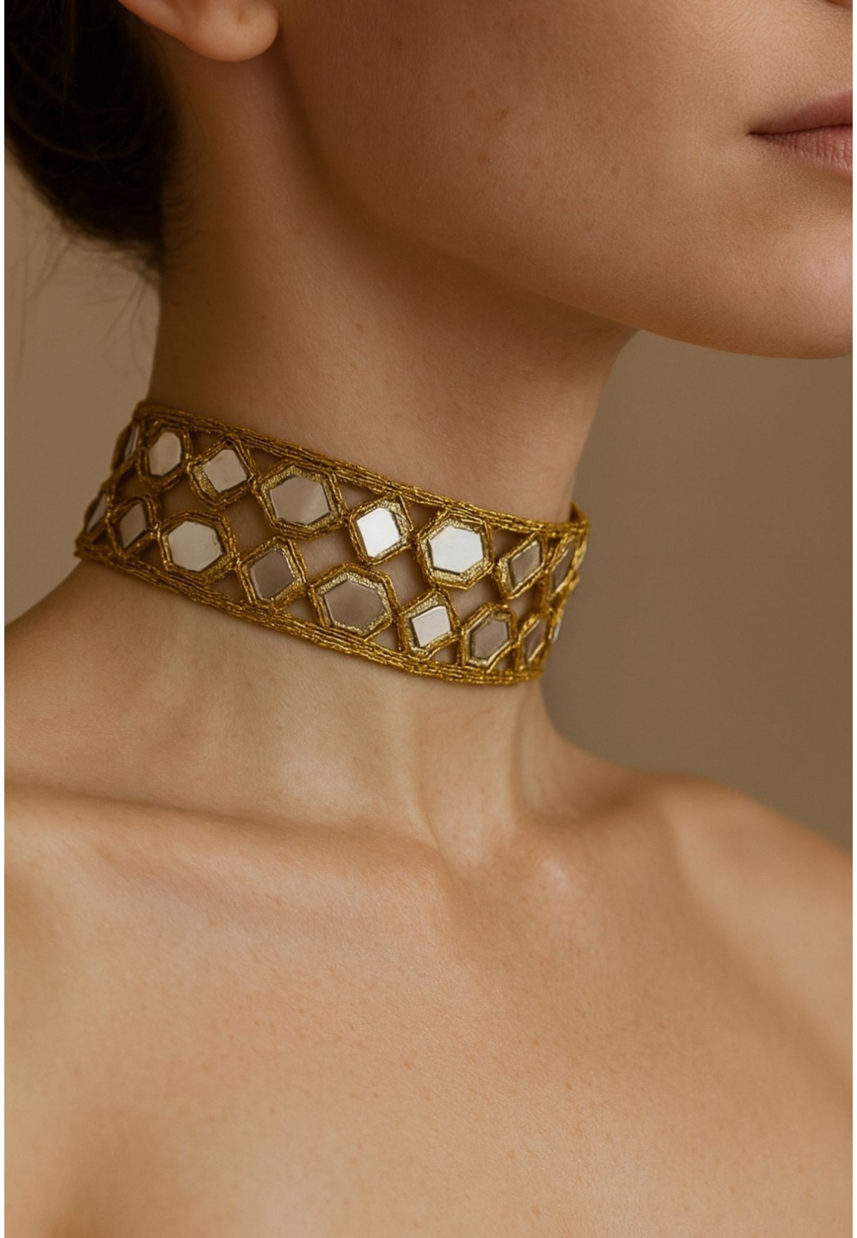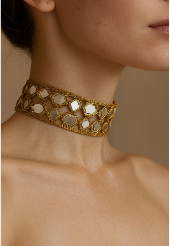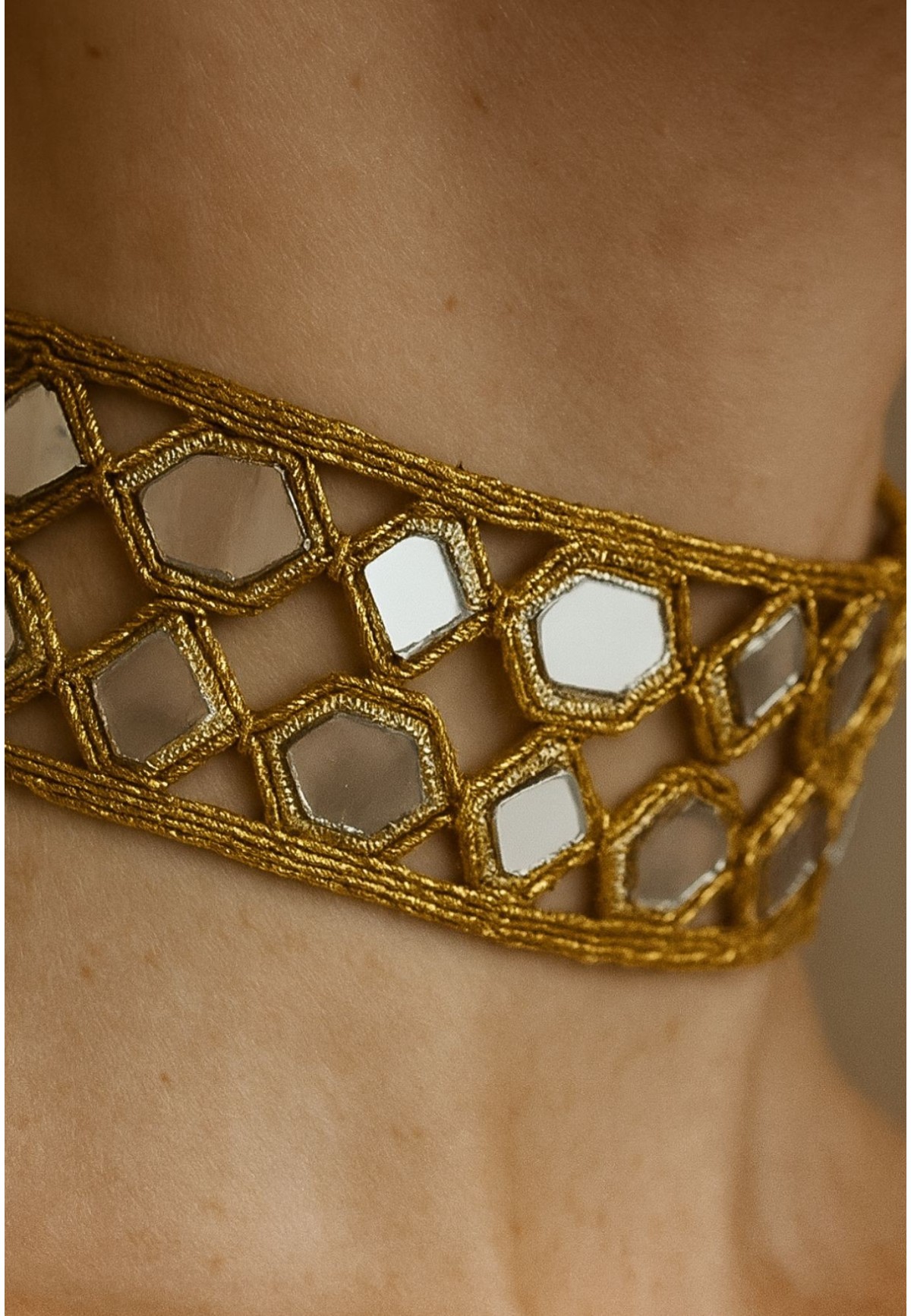 El choker artesanal dorado con cristales bordados a mano es un accesorio que combina tradición y tendencia, ideal para realzar cualquier conjunto con un toque sofisticado.