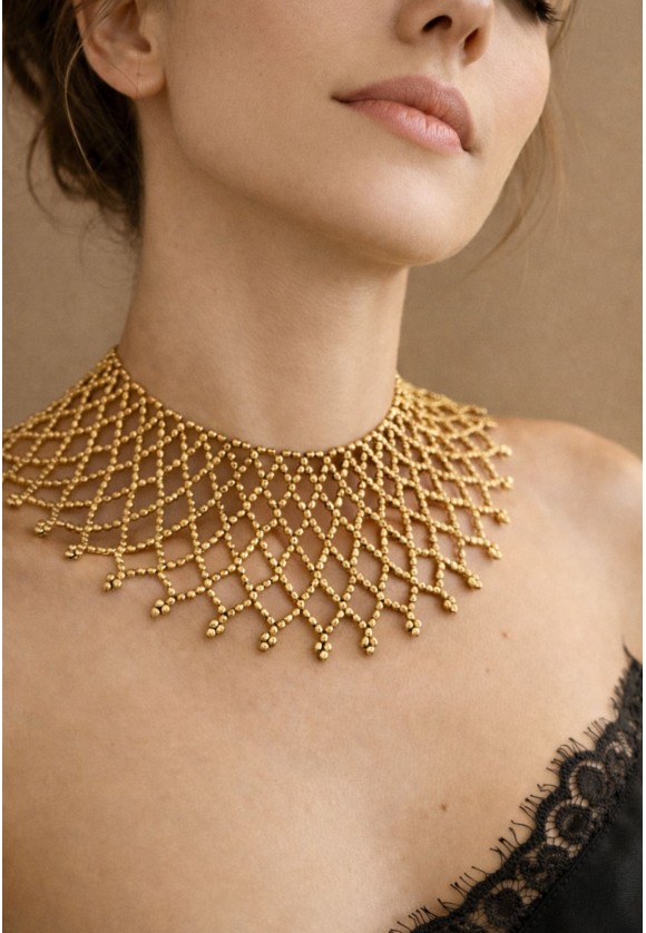 Este collar dorado tipo red está diseñado para convertirse en el foco del look. Su estructura de abalorios en forma de cubo crea un dibujo geométrico ligero y elegante que se adapta al cuello como una segunda piel.