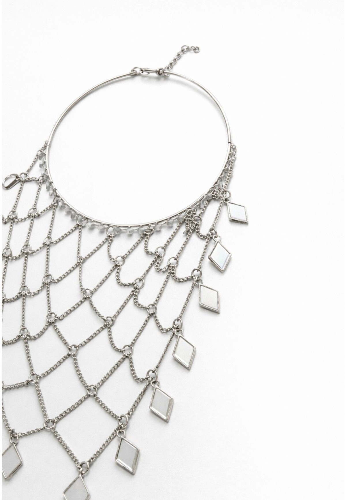 La combinación de la red de cadenas con los abalorios geométricos colgantes aporta movimiento, brillo y personalidad, convirtiéndolo en un accesorio protagonista que no pasa desapercibido.