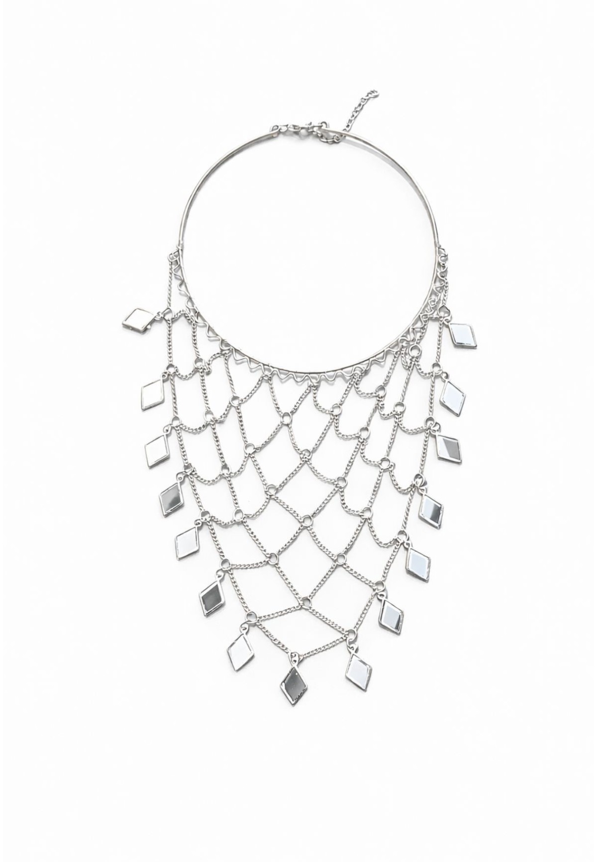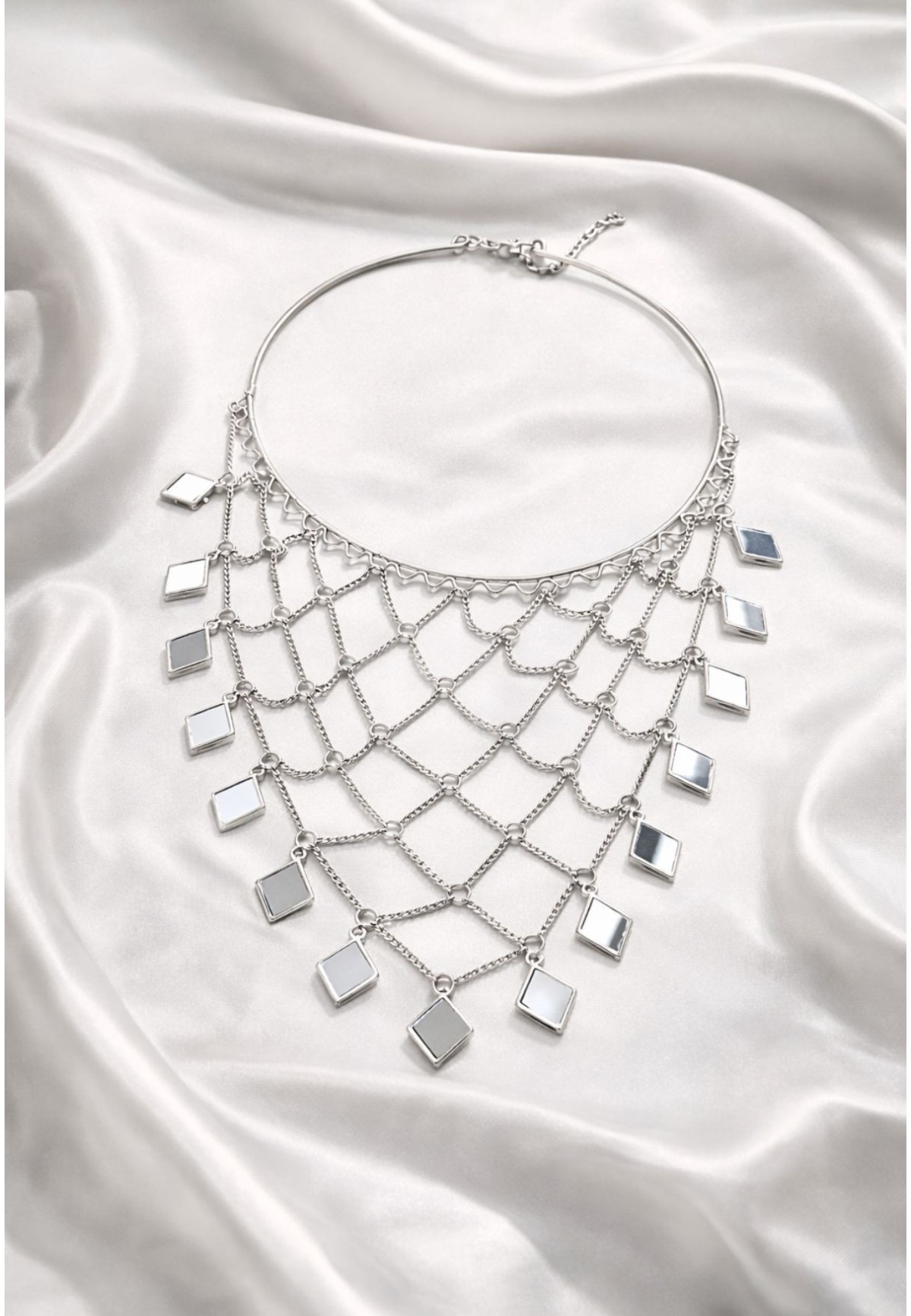 Este collar plateado de diseño en red es una de esas piezas que transforman cualquier look al instante. Su estructura ligera y su caída geométrica crean un efecto visual elegante y muy especial, perfecto para elevar estilismos de invitada o looks más sobrios que necesitan un punto de luz.