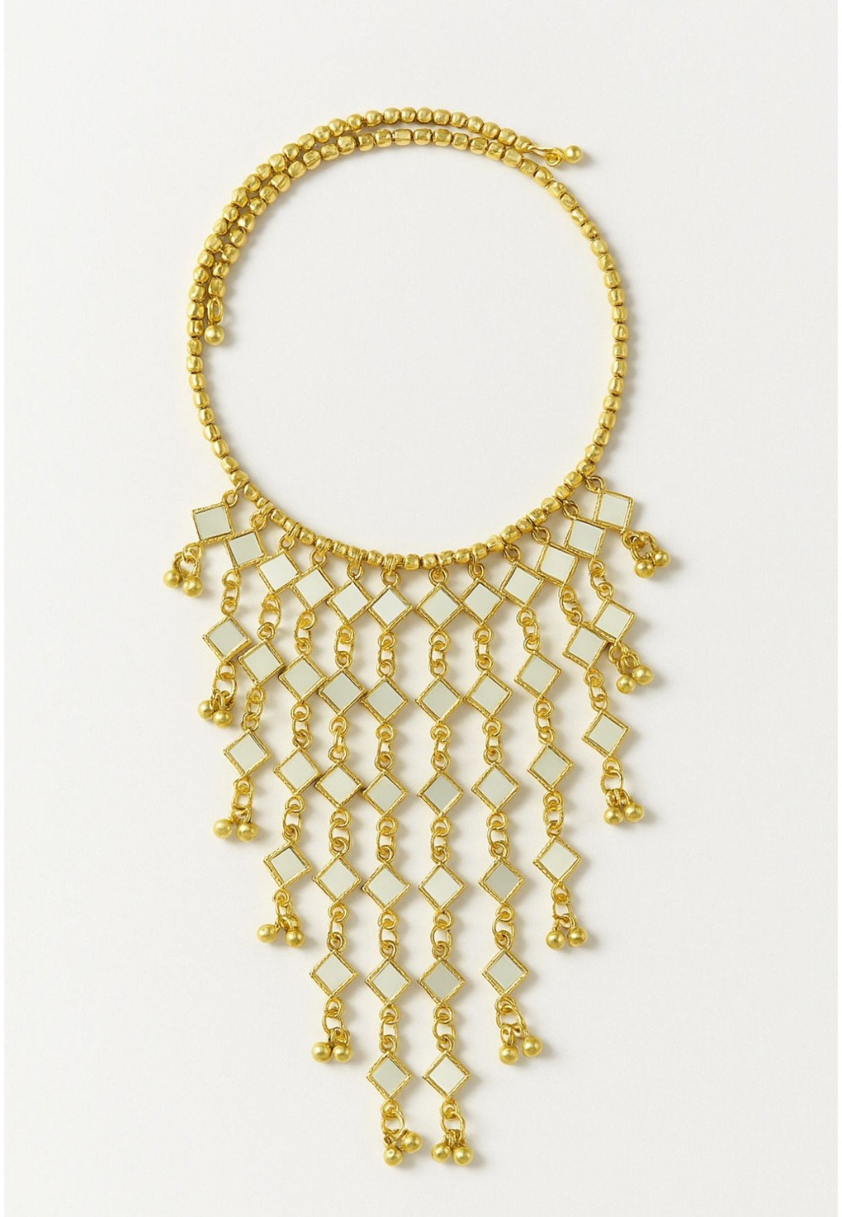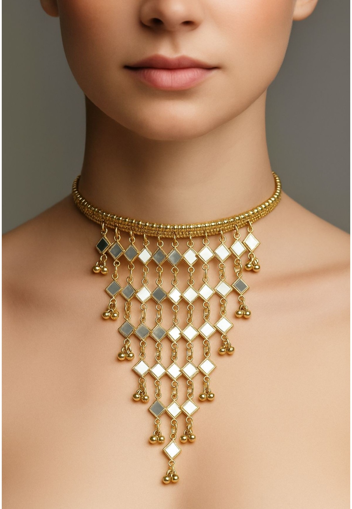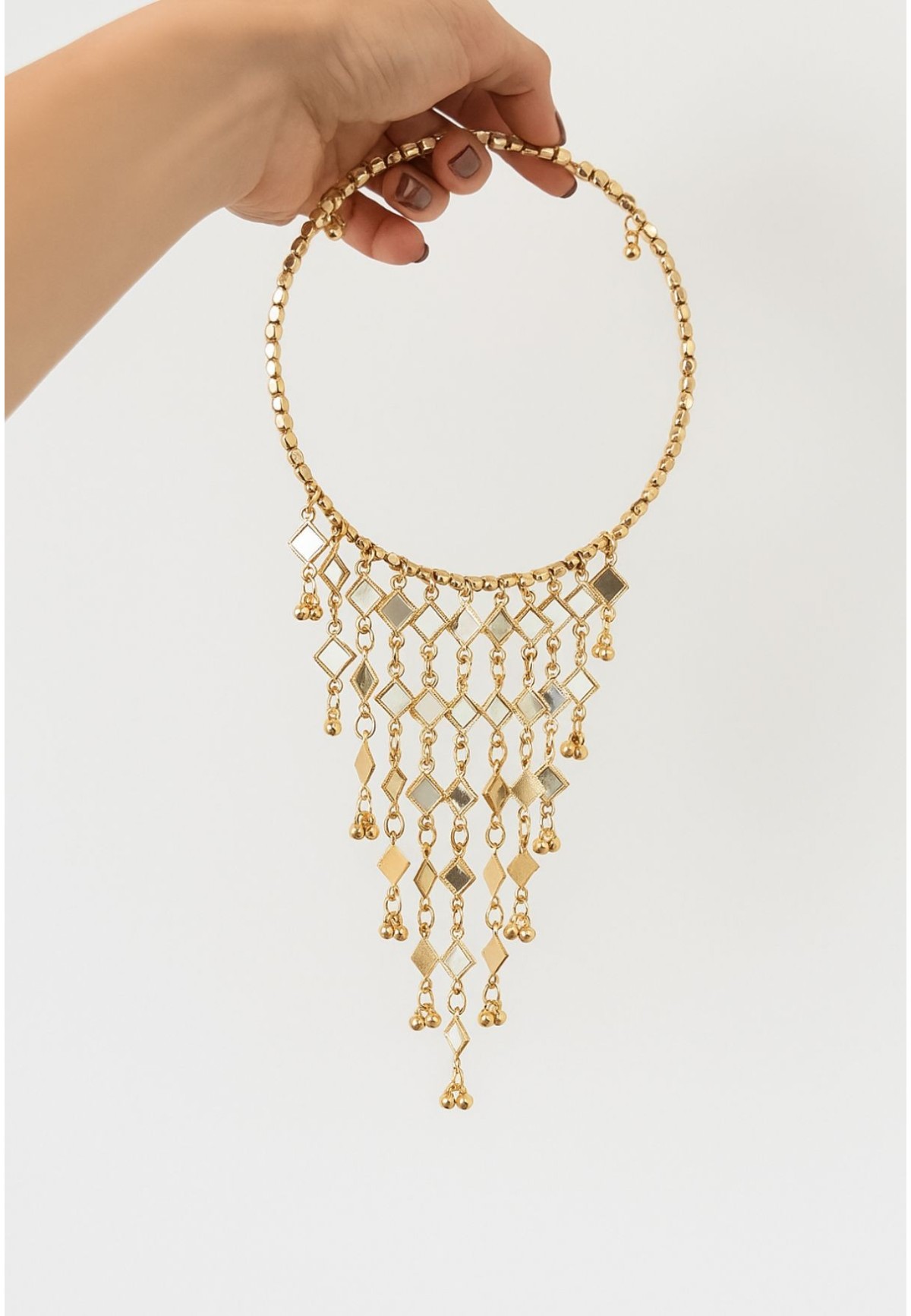 Si buscas una gargantilla dorada que lo haga todo por tu look, este choker con espejos en cascada es ese accesorio que transforma cualquier vestido liso en un outfit de invitada especial. La parte superior está formada por un aro rígido de bolitas doradas que rodea el cuello, y de él cuelga una cascada de pequeñas piezas geométricas de espejo en forma de rombo que reflejan la luz a cada movimiento.