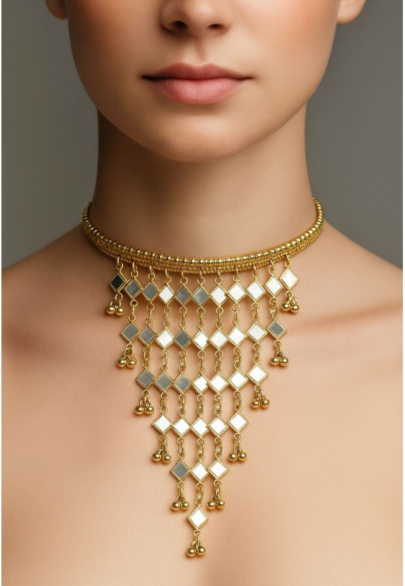 El efecto es muy llamativo pero sigue siendo elegante: los espejos atrapan la luz del ambiente y crean destellos sutiles, perfectos para bodas, fiestas de noche o eventos donde quieras que el foco vaya directo al escote y al rostro. Aunque visualmente es potente, la gargantilla es ligera, por lo que podrás llevarla durante horas sin sensación de peso.