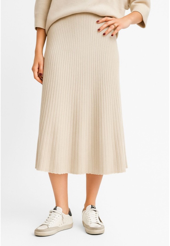 Esta falda de punto beige es una de esas prendas que combinan comodidad y estilo sin esfuerzo. Su diseño acanalado vertical estiliza la silueta, mientras que el tejido suave y elástico se adapta al cuerpo con una caída fluida y favorecedora.