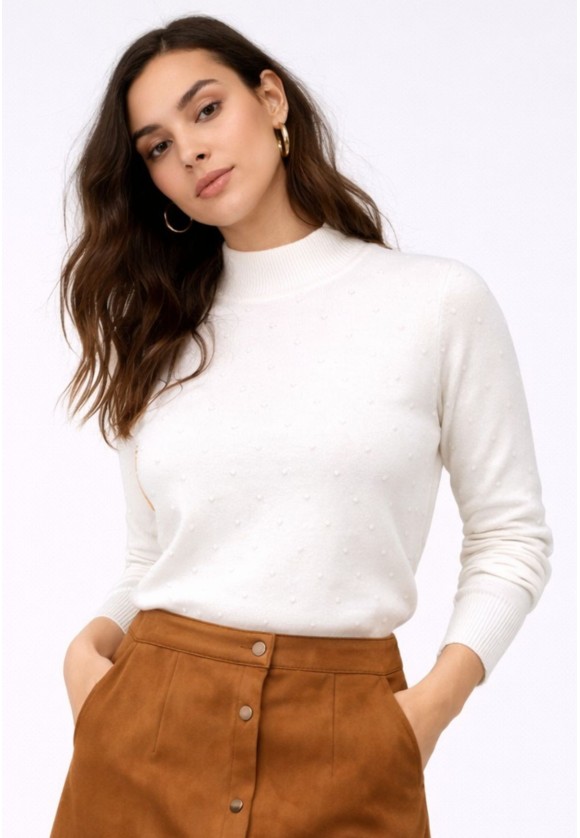 El jersey blanco de punto fino para mujer con lunares bordados de Bluwer es ese básico especial que no puede faltar en tu armario. Diseñado en un tejido suave y ligero, combina comodidad y estilo en una prenda ideal tanto para el día a día como para ocasiones más cuidadas.