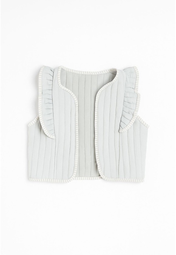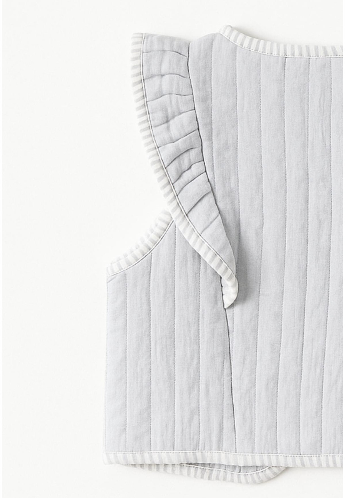 Este chaleco acolchado azul con volantes es ideal para elevar cualquier look con un toque femenino y especial. Su diseño ligero y acolchado lo convierte en una prenda cómoda, mientras que el detalle de los volantes en los hombros aporta un aire romántico y estilizado.