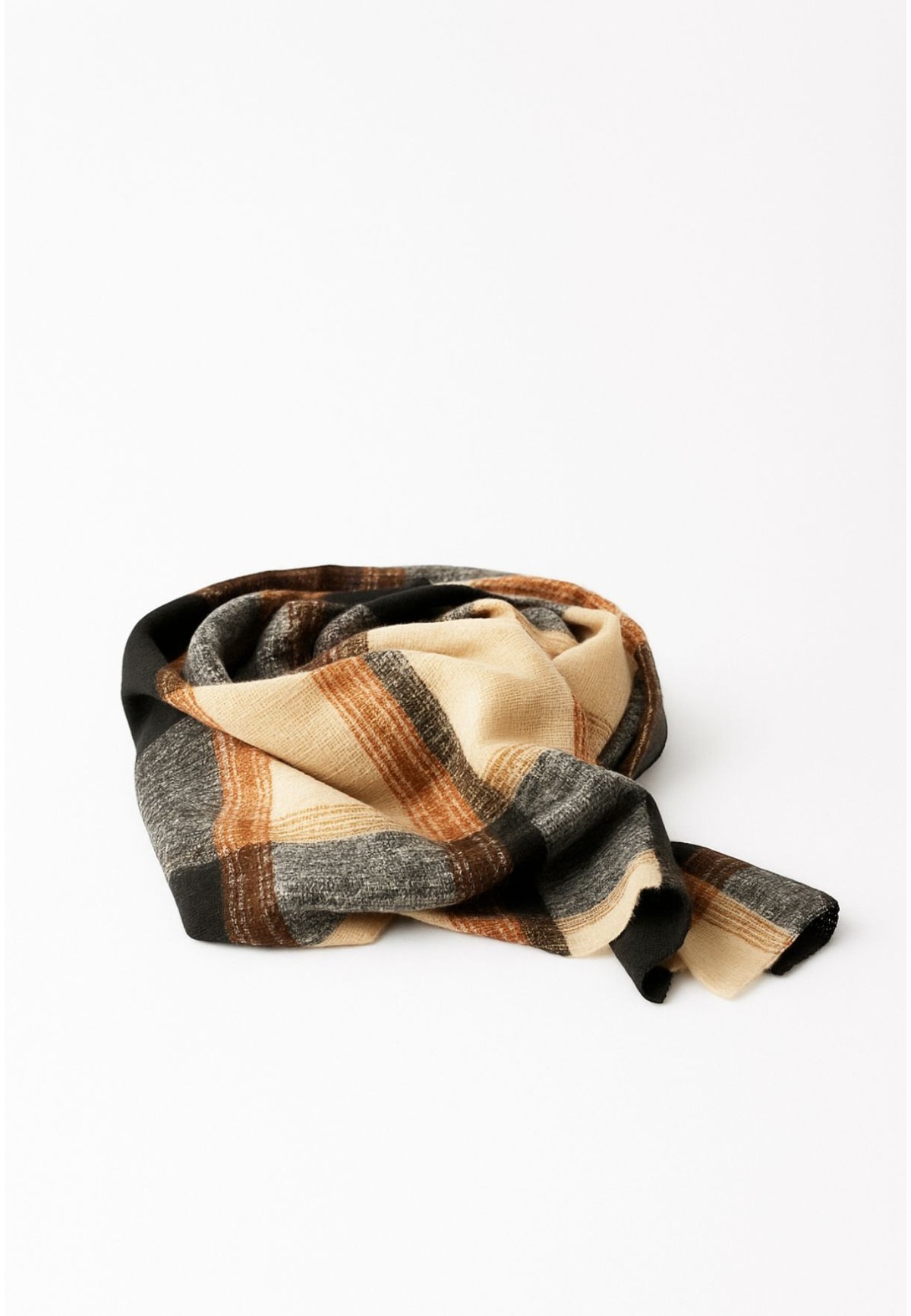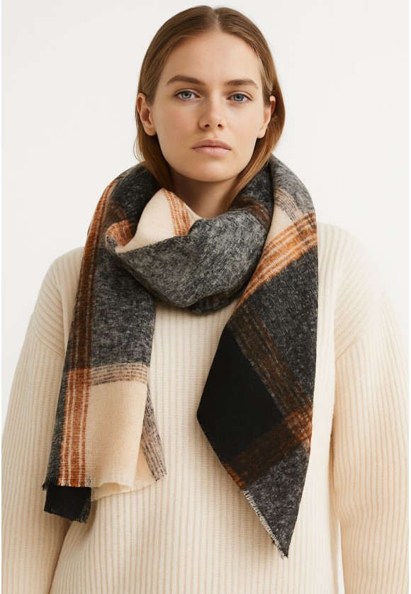 La bufanda de cuadros en tonos neutros es el accesorio perfecto para sumar estilo y calidez a cualquier look. Su diseño combina tonos beige, camel, negro y gris, creando una paleta armoniosa y elegante que se adapta a cualquier outfit de otoño o invierno 🍂.