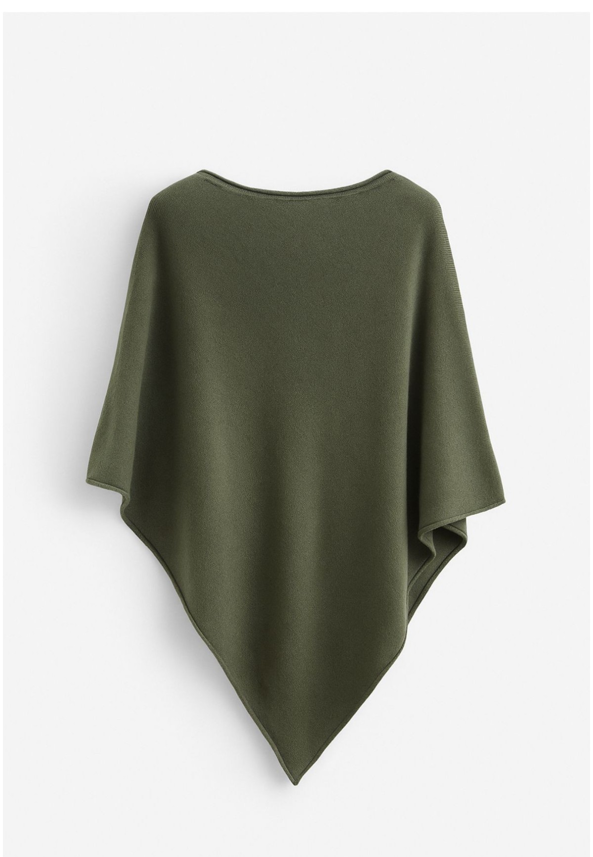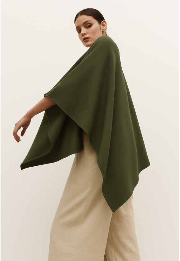 Esta capa en color verde oliva es esa prenda que eleva cualquier look con cero esfuerzo. Su cuello barco y su caída fluida envuelven el cuerpo de manera suave y favorecedora, aportando calidez sin renunciar a la ligereza.