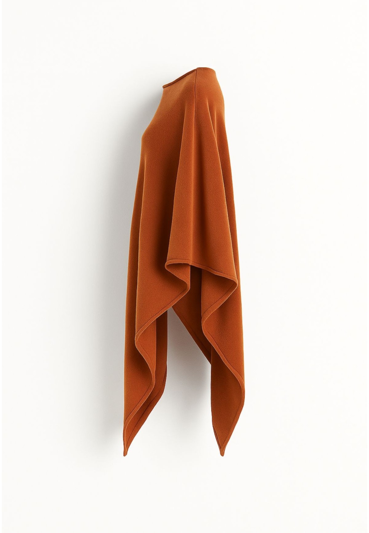 Esta capa de punto amplia en color caldera es una de esas prendas que se adaptan a cada día sin esfuerzo. Su tejido suave y con caída natural aporta comodidad y presencia, mientras que el cuello barco mantiene un acabado limpio y favorecedor. La forma en punta cae de manera fluida creando una silueta ligera que acompaña el movimiento.
