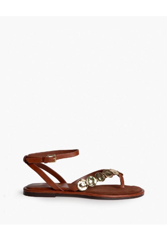Sandalia plana cuero con monedas doradas y hebilla - Cuero