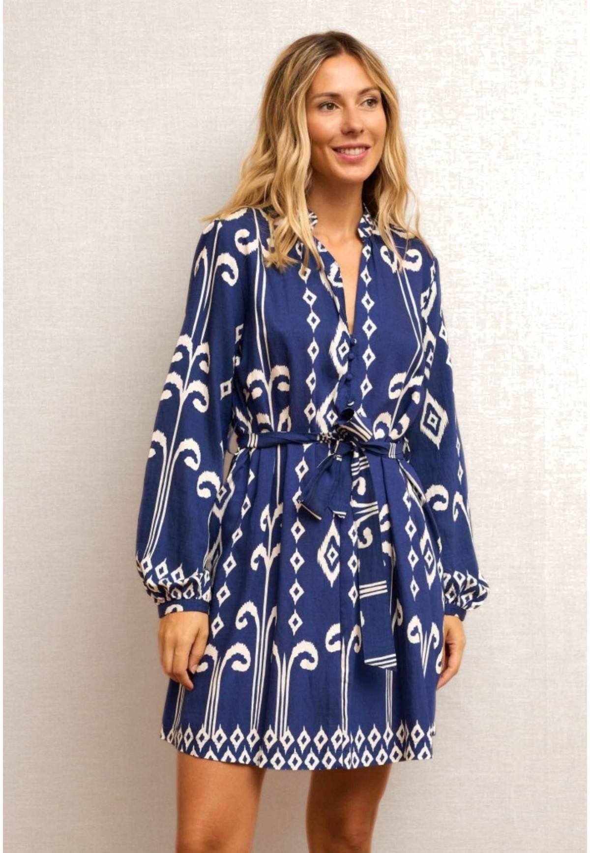 Este vestido corto azul con estampado geométrico en blanco es cómodo, versátil y perfecto tanto para el día a día como para un plan afterwork. Su cinturón ajustable marca la silueta y sus mangas largas con puño fruncido aportan un aire boho y fresco.