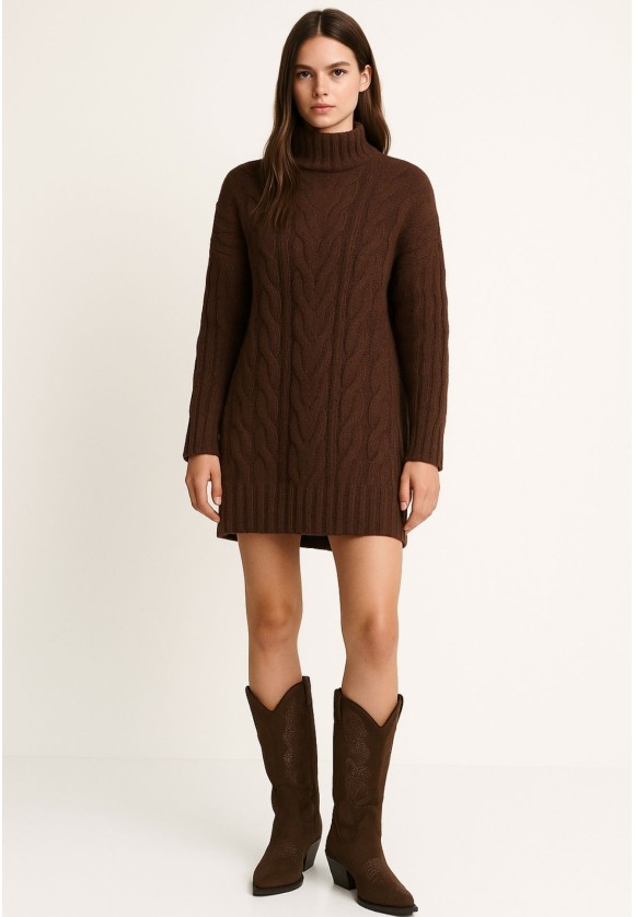 Vestido corto marrón mujer de punto trenzado con cuello vuelto