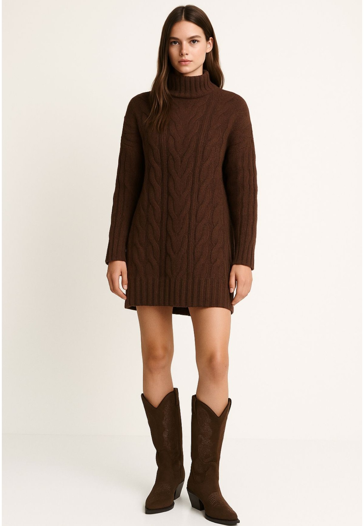 El vestido marrón de punto trenzado con cuello vuelto es la prenda que une comodidad y estilo sin esfuerzo. Confeccionado en una mezcla suave de fibras con lana y viscosa, abriga sin resultar pesado y se adapta con fluidez a la silueta.