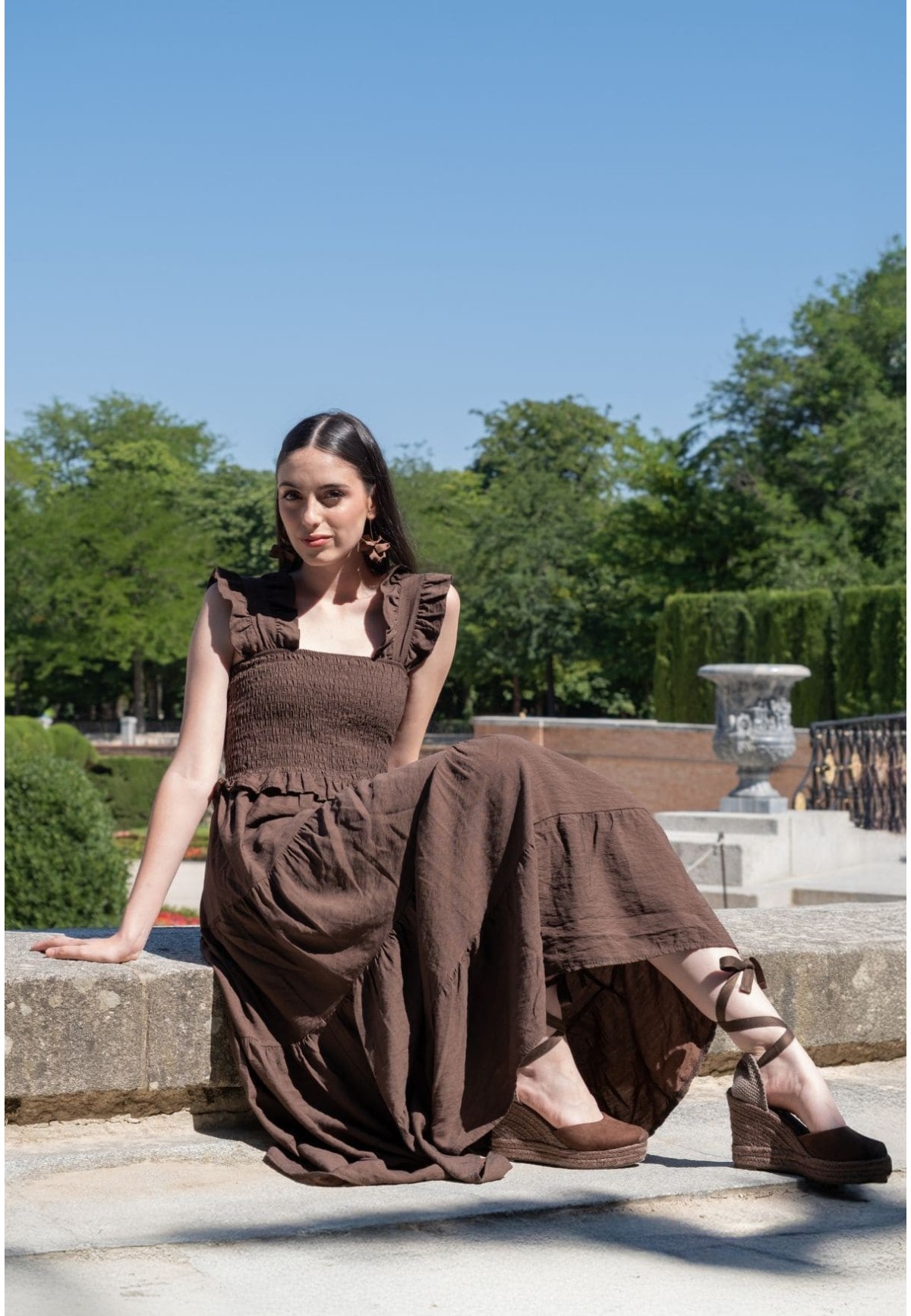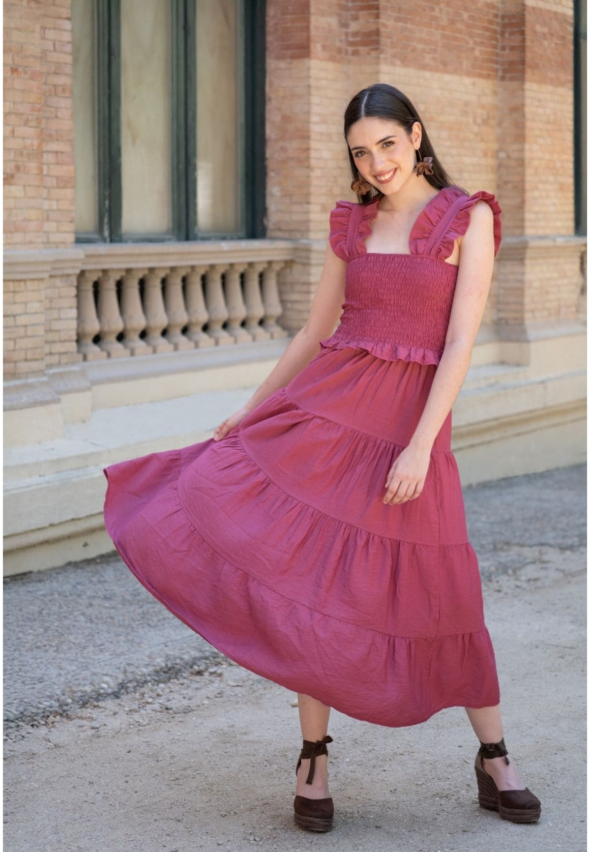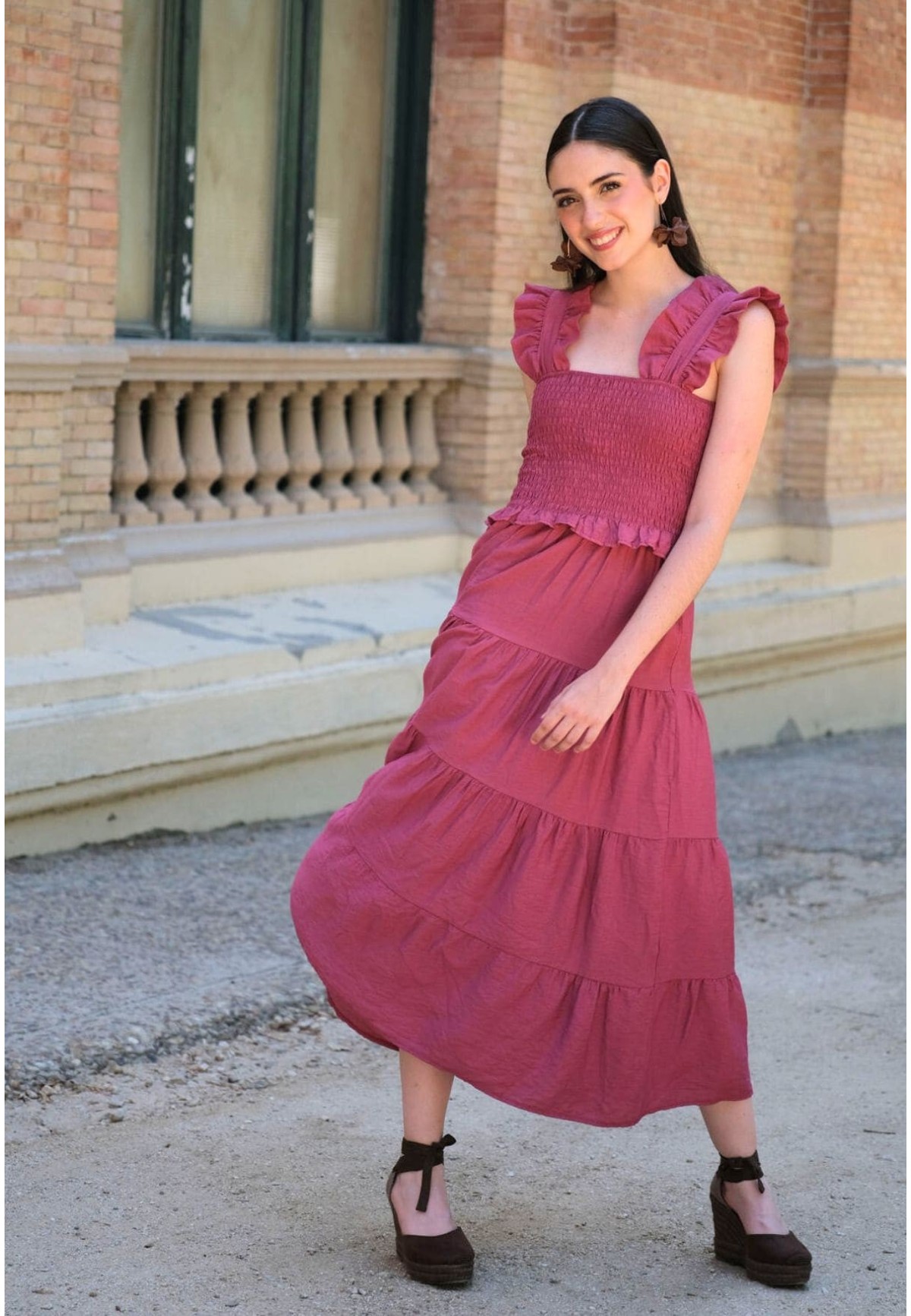 El fruncido de  nido de abeja en el pecho garantiza comodidad y sujeción, realzado por los tirantes anchos con volantes que suman un toque coqueto. Su silueta midi y caída amplia te aseguran movimiento y frescura en los días más cálidos.