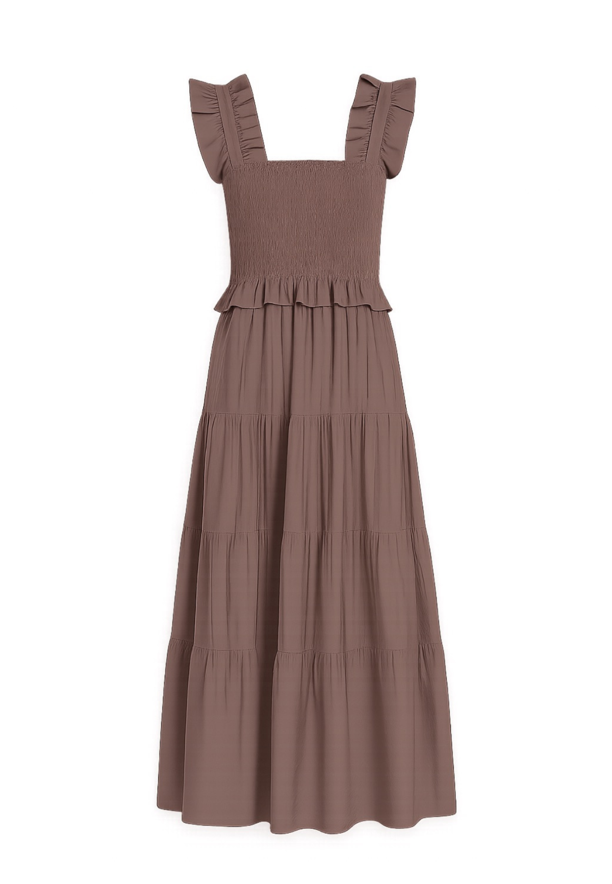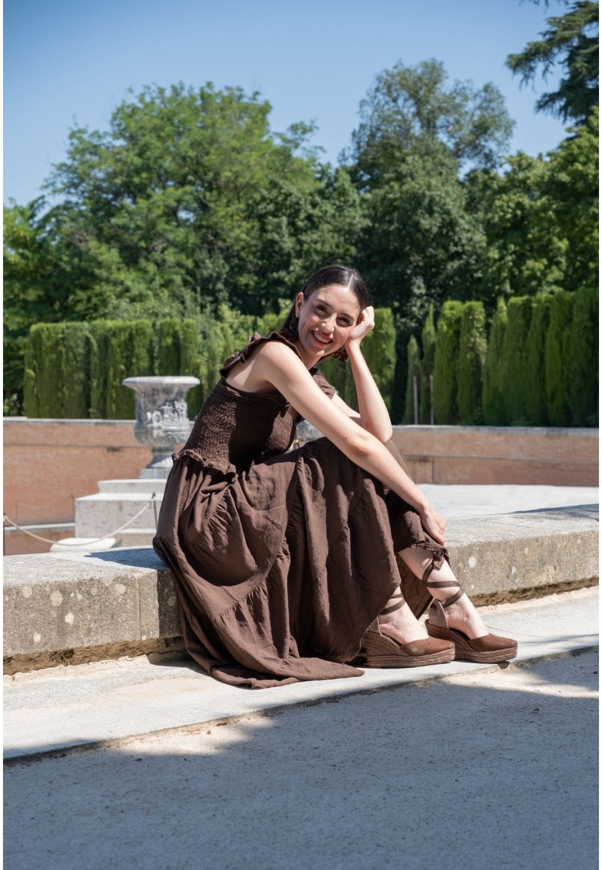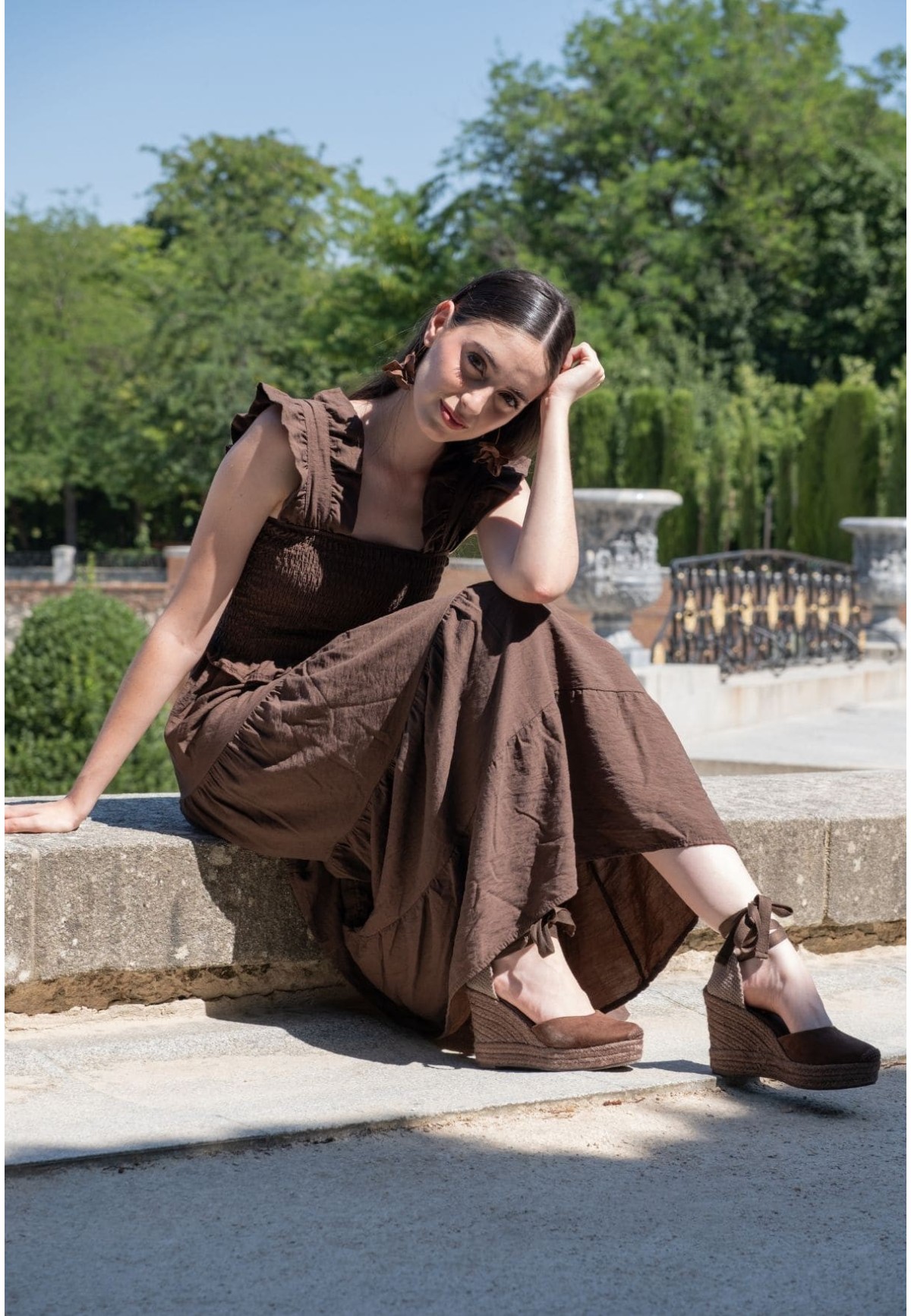 El fruncido de  nido de abeja en el pecho garantiza comodidad y sujeción, realzado por los tirantes anchos con volantes que suman un toque coqueto. Su silueta midi y caída amplia te aseguran movimiento y frescura en los días más cálidos.