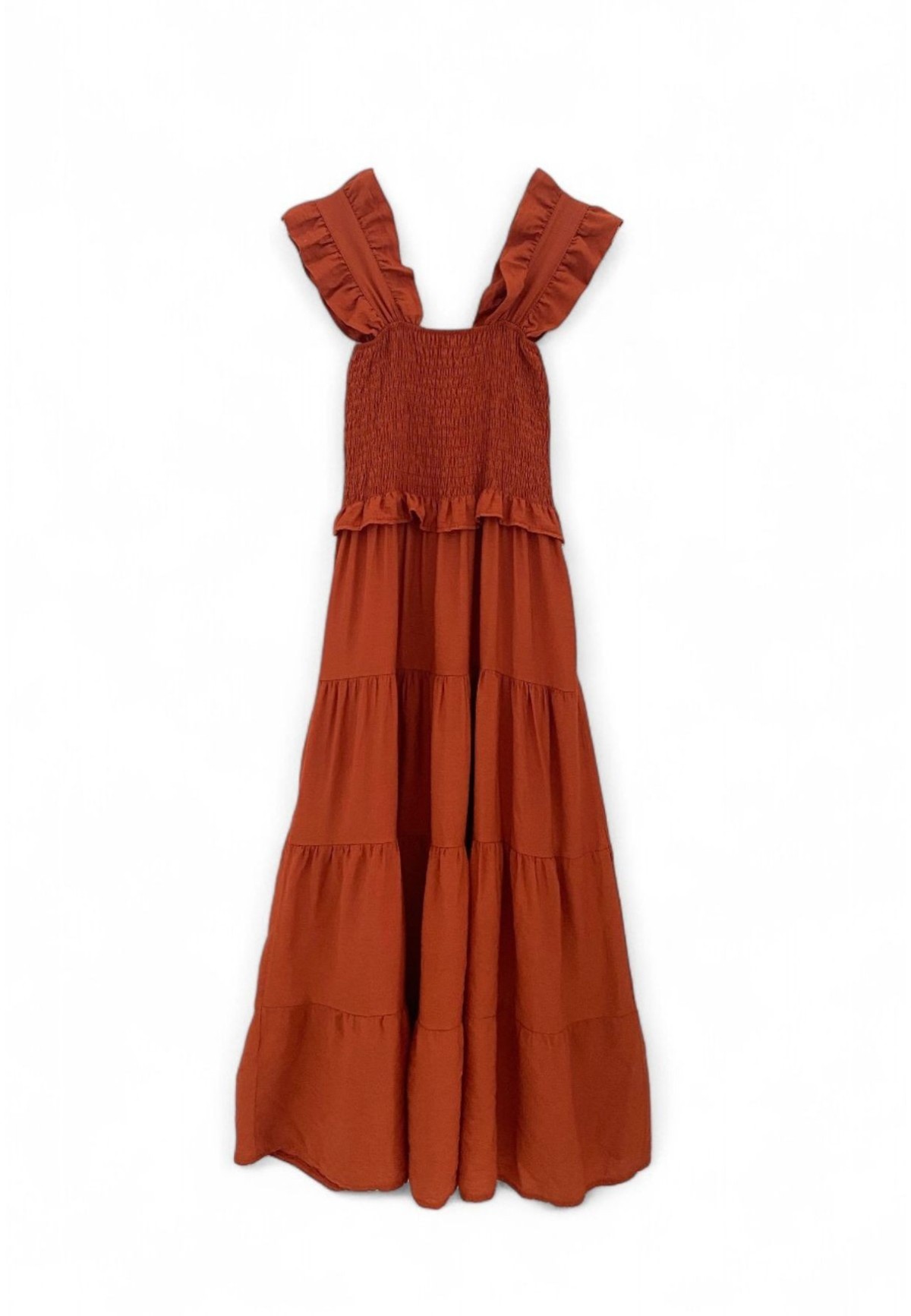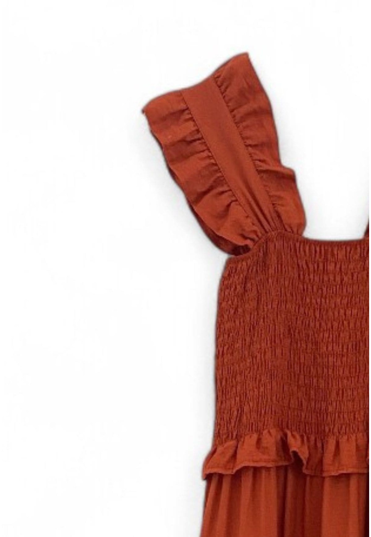 Vestido midi evasé color buganvilla con nido de abeja y volantes | Bluwer