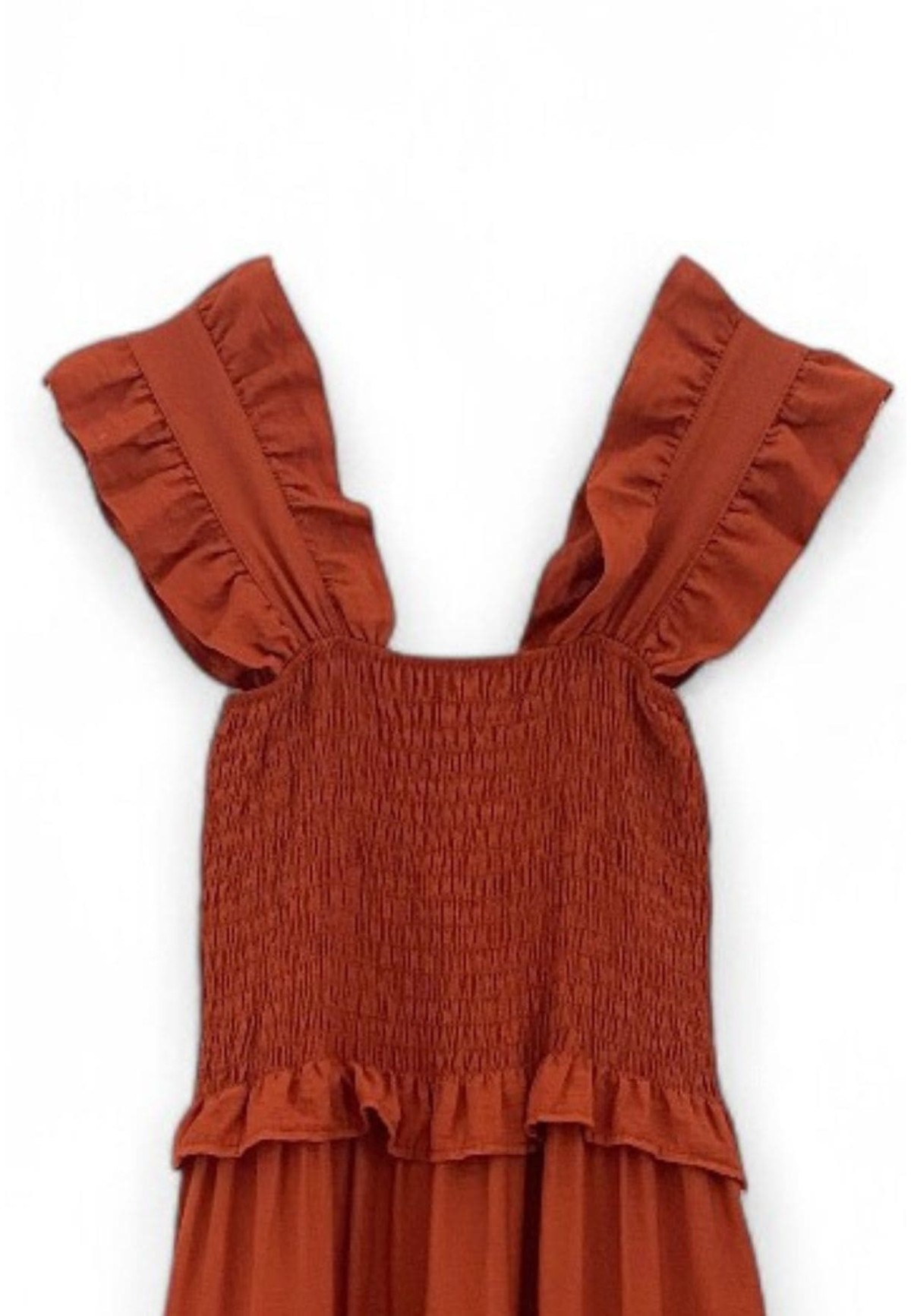 Este vestido en color buganvilla es la opción perfecta para destacar con un aire romántico y alegre. Su tono intenso y su corte evasé hacen que sea ideal para el verano, mientras que los detalles de volantes y el cuerpo nido de abeja garantizan comodidad y estilo.
