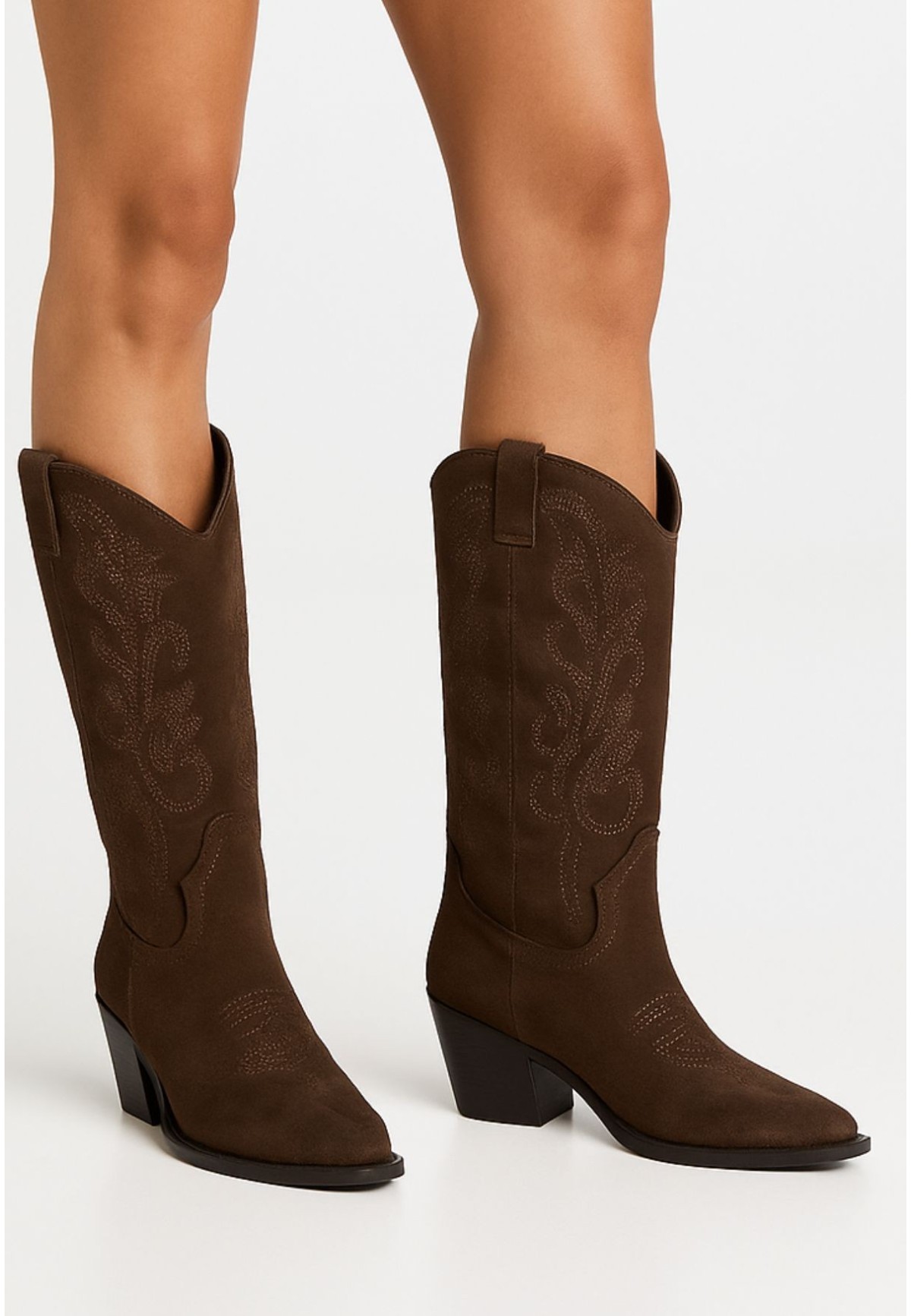 Atrévete con el estilo western más auténtico con estas botas cowboy en color chocolate. Un diseño versátil y cómodo que combina ante suave, detalles bordados y un tacón medio ideal para el día a día o para elevar tus looks de temporada.